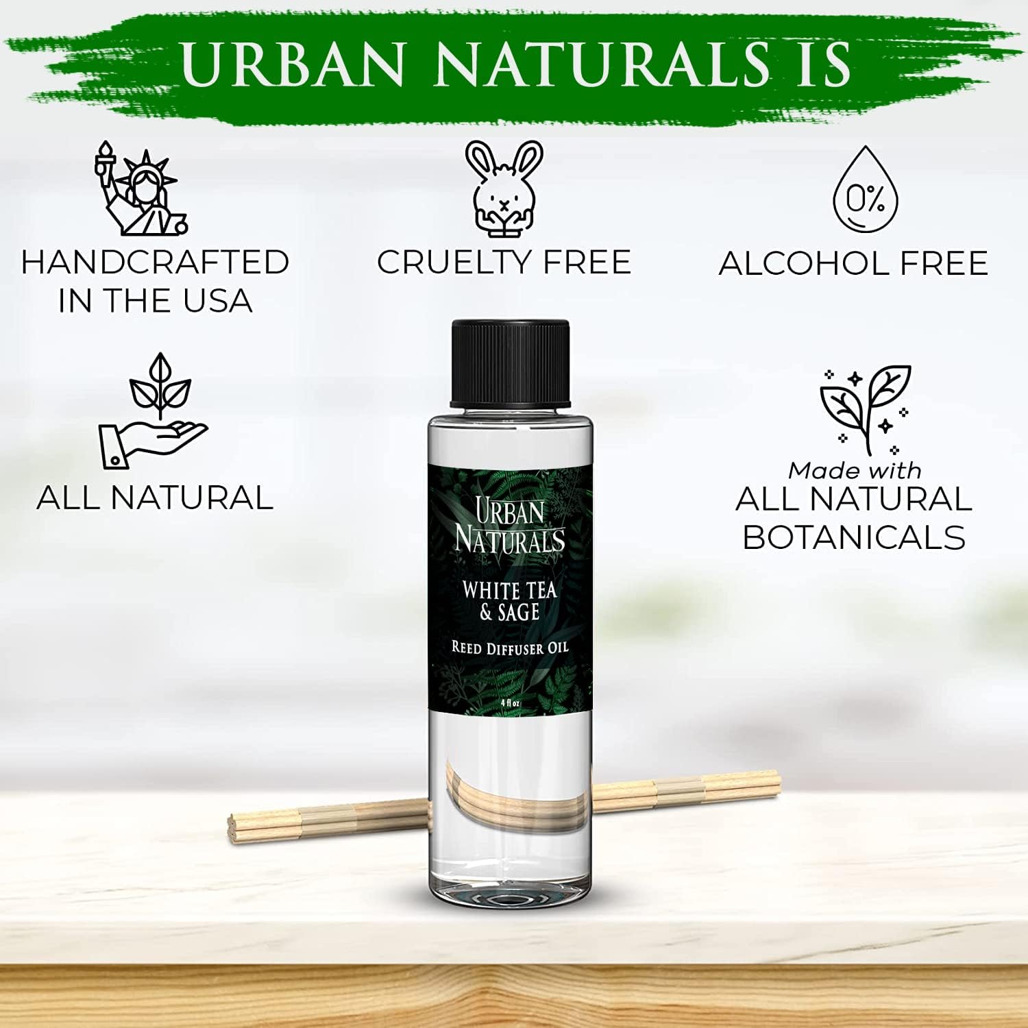 Urban Naturals Reed Diffuser Oil Refill White Tea & Sage, Sparkling Bergamot, Fresh Sage, 4 oz + Free Reed Sticks, Made in The USA