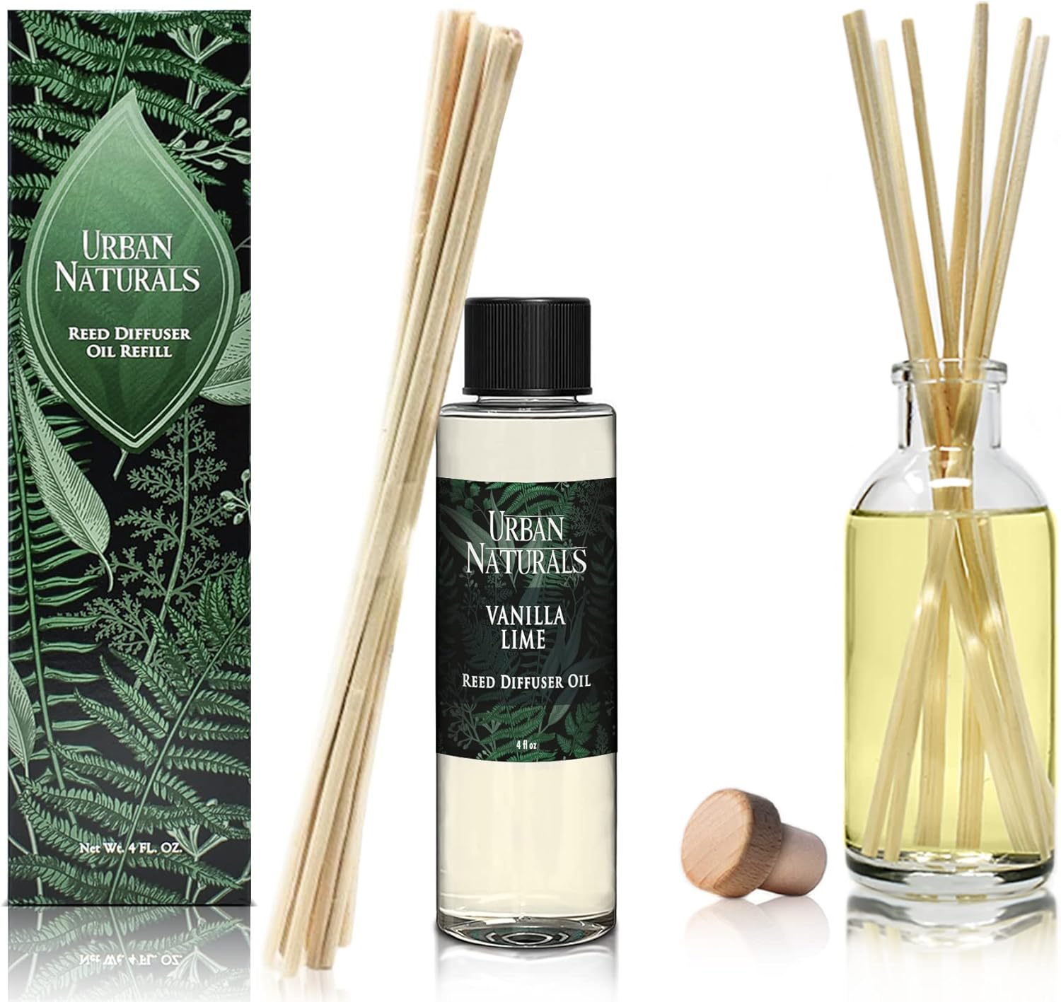 Urban Naturals Reed Diffuser Oil Refill, Vanilla Lime Citrus Essential Oils with Cane Sugar, Lime, Vanilla, 4 oz + Free Reed Sticks, Made in The USA