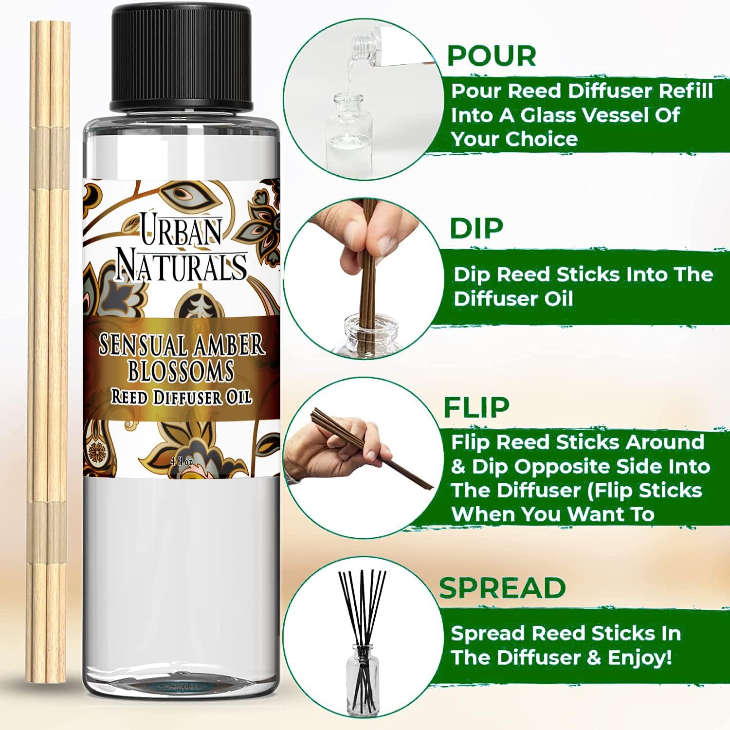 Urban Naturals Reed Diffuser Oil Refill, Sensual Amber Blossoms Fragrance Oil with Jasmine, Amber, Vanilla, 4 oz + Free Reed Sticks, Made in The USA