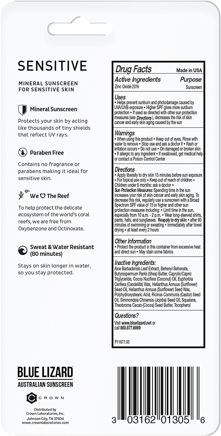 BLUE LIZARD Sensitive Mineral Sunscreen Stick with Zinc Oxide, SPF 50+, Water Resistant, UVA UVB Protection Easy to Apply, Fragrance Free, 0.5 Oz (Pack of 2)