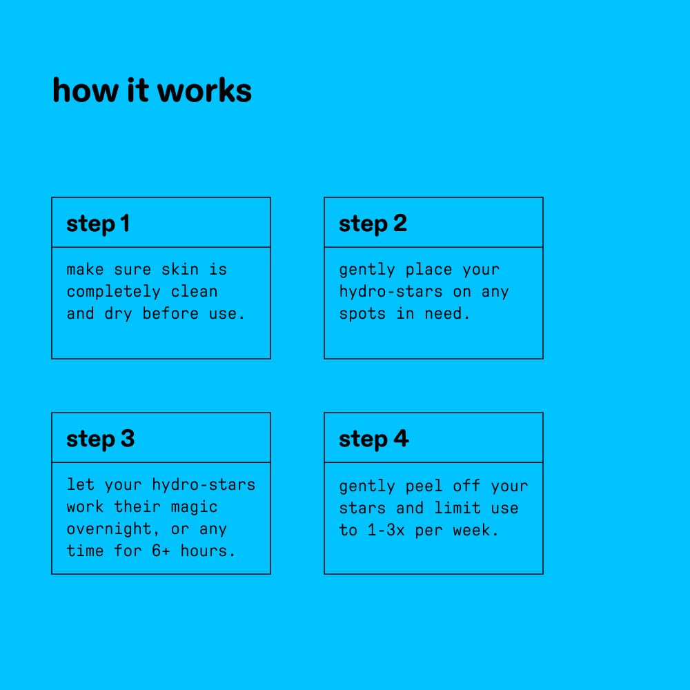 - EASY TO USE: Apply to clean, dry skin. Leave on overnight (or 6+ hours) and limit use to 1-3x per week. When you run out of stars, refill your compact with a new pack of Hydro-Star + Salicylic Acid.