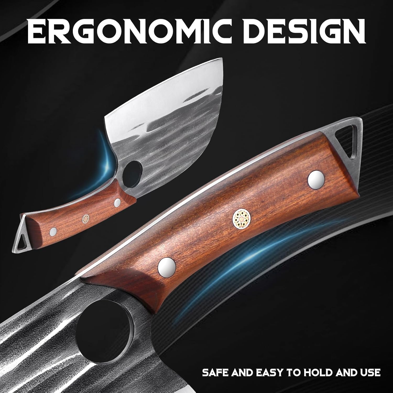 - 【Ergonomic Contours】A handsome Rosewood full tang handle of Serbian Chefs Knife ensures a powerful, non-slip and comfortable grip. Bone chopper knife heavy duty has strong bolster which can protect your fingers. You can pull free with the positioning of the safety hole in the center of the outdoor cooking knife when stuck in cutting meat.