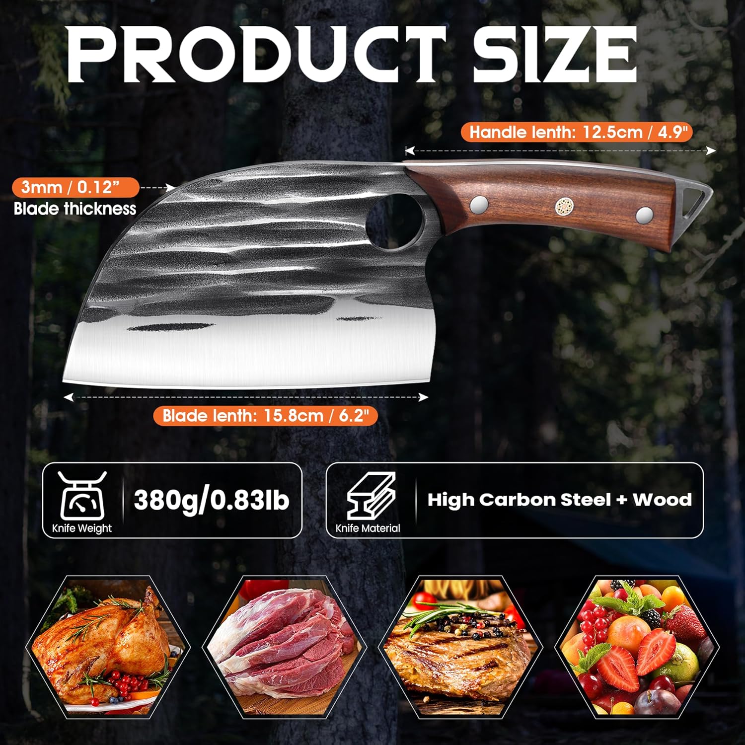 - 【Premium Toughness and Durability】 The hand forged Serbian chef knife is tempered in 58 HRC to achieve tough resilience. The use of high carbon steel provides resistance to corrosion and stains on the sharp blade and ensures excellent edge retention for meat cleaver butcher knife. Care must still be taken to clean and dry the blade after use to avoid unnecessary corrosion due to water.