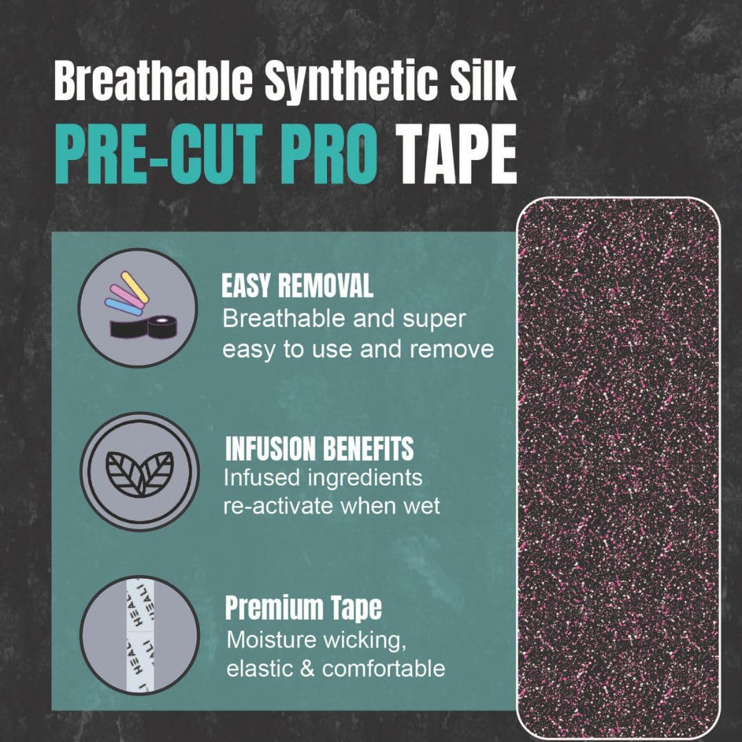 - PRODUCT DETAILS AND PERFORMANCE: 20 precut strips per roll of pro kinesiology tape. Strip Size (Width x Length) - 5cm x 25cm 2" x 10"; Product Type: Precut. Heali PRO Kinesiology Tape is infused with Magnesium and Menthol directly on the tape to support daily movement and active performance. Heali PRO Tape is made with soft and breathable synthetic silk and is latex free. The strong (sticky) adhesive lasts for 4-7 days.