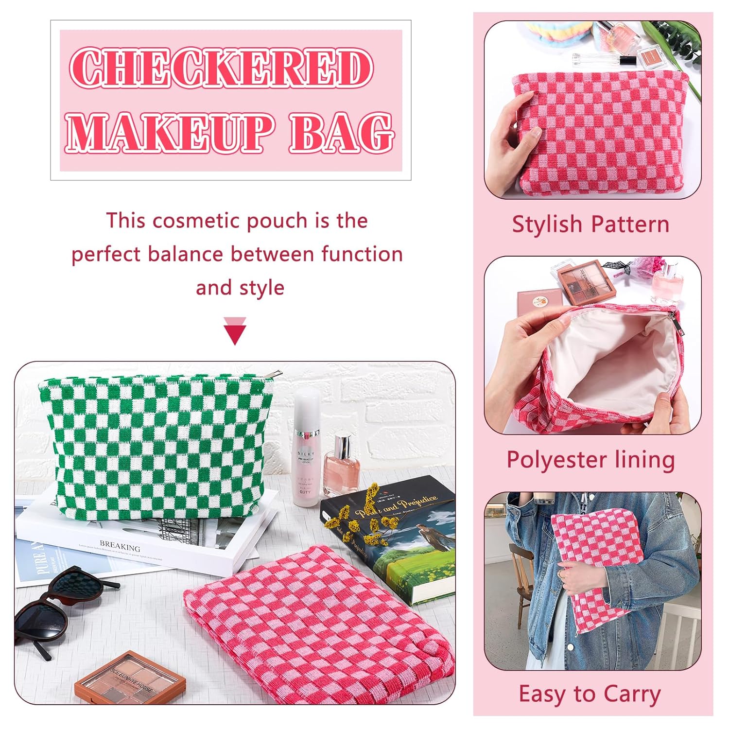- LIGHT WEIGHT AND EXCELLENT WORKMANSHIP: The cute makeup pouch is made of soft knitted fabric and is comfortable, soft and lightweight. Checkered travel make up bag folds up when not in use and fits in a large bag without taking up space. The metal zipper pull keep your items secure and organized inside. Cosmetic bag accessories set for women