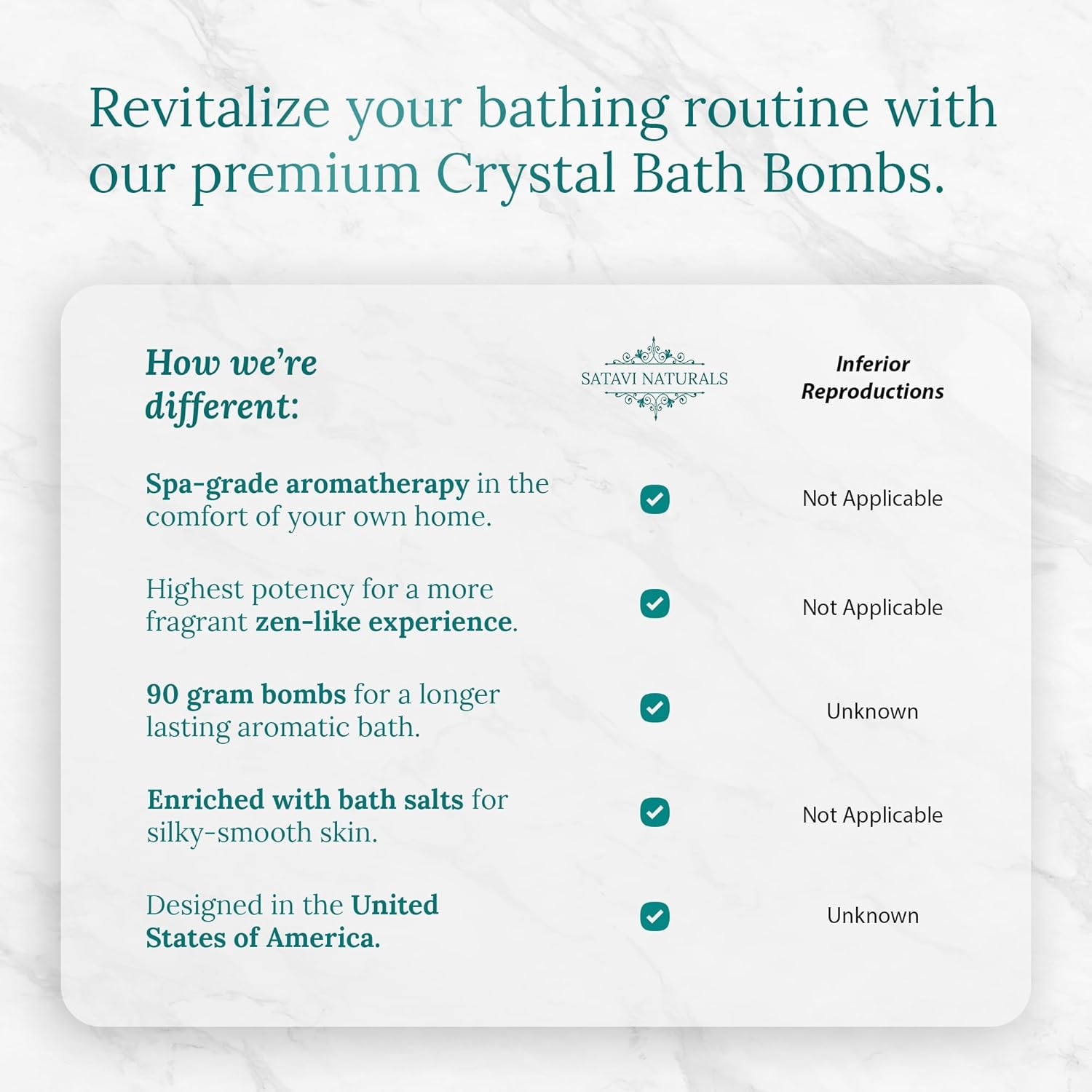 - Professional Spa-Grade Relaxation: Elevate your self-care routine with Satavi Naturals Crystal Bath Bombs. Crafted from only the finest ingredients, our long-lasting bath bombs weigh 90 grams each and come meticulously curated with three unique scents - Lavender, Eucalyptus & Mint, and Citrus Blend.