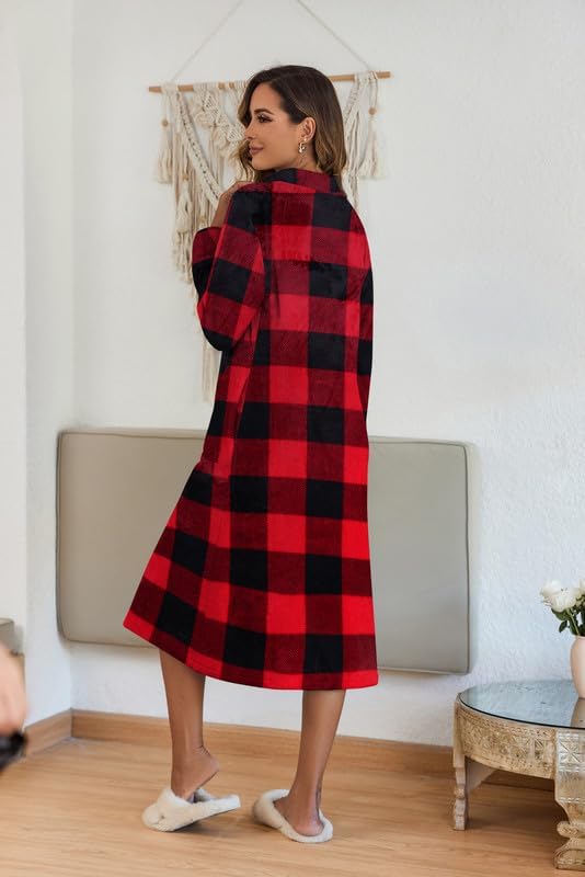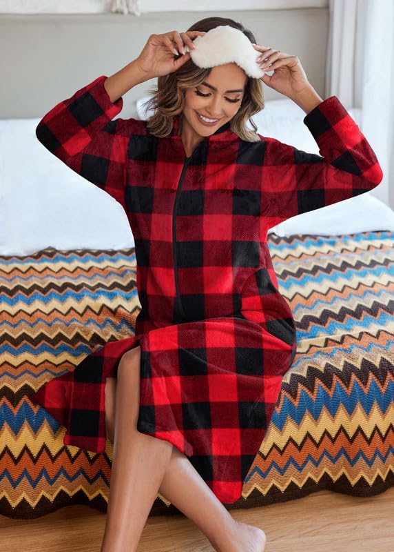 Ekouaer Women's Zip Up Robe Fleece Bathrobe Long Zipper Lounger Warm Housecoat Long Sleeve Nightgown with Pockets S-XXL