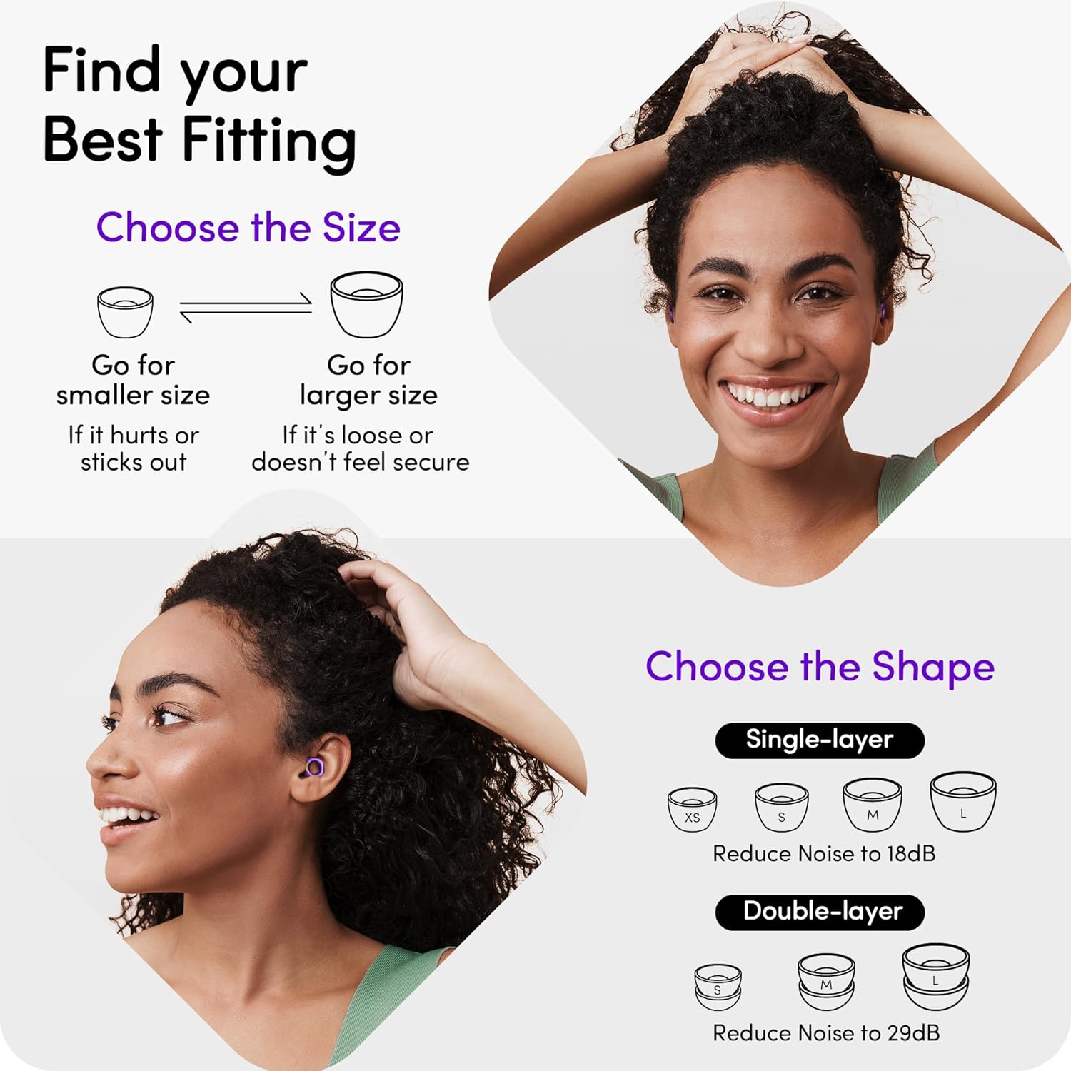 - Stylish Comfort - These earplugs come with 2 types of ear tips. The single-layer ear tips (4 sizes) provide a noise reduction rating up to 18 decibels; the double-layer ones (3 sizes) provide noise reduction rating up to 29 decibels - So that you can always find the perfect fit. The unique square shape can be angled to fit tightly and avoid falling off. It look like a fashionable accessory while protecting your hearing.