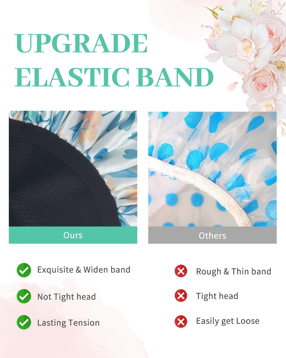 - 【TRIPLE-LAYER DESIGN】:Our waterproof shower caps are made with a soft satin fabric, waterproof EVA cloth, and terry cloth for extra absorption. Say goodbye to soggy hair