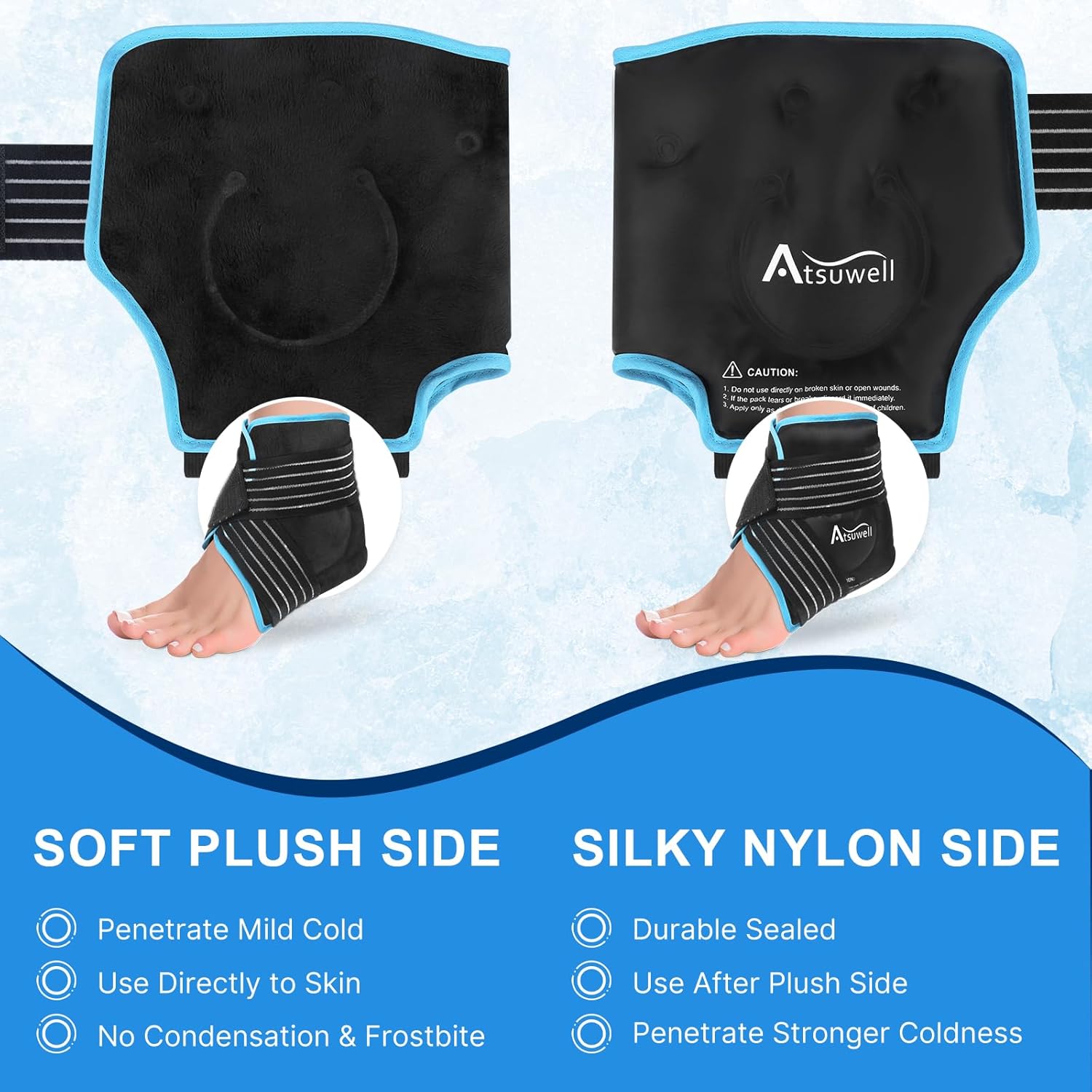 - Fabulous Quality and Reusable Ice Wrap Ankle: Atsuwell foot and ankle ice pack stays smooth and pliable when frozen. The gel packs contour around your ankle shape, providing a better soothing experience and targeted cold compression. The wide-sealed edge and extra-thick nylon cover are reliable and durable without worrying about gel leaking.