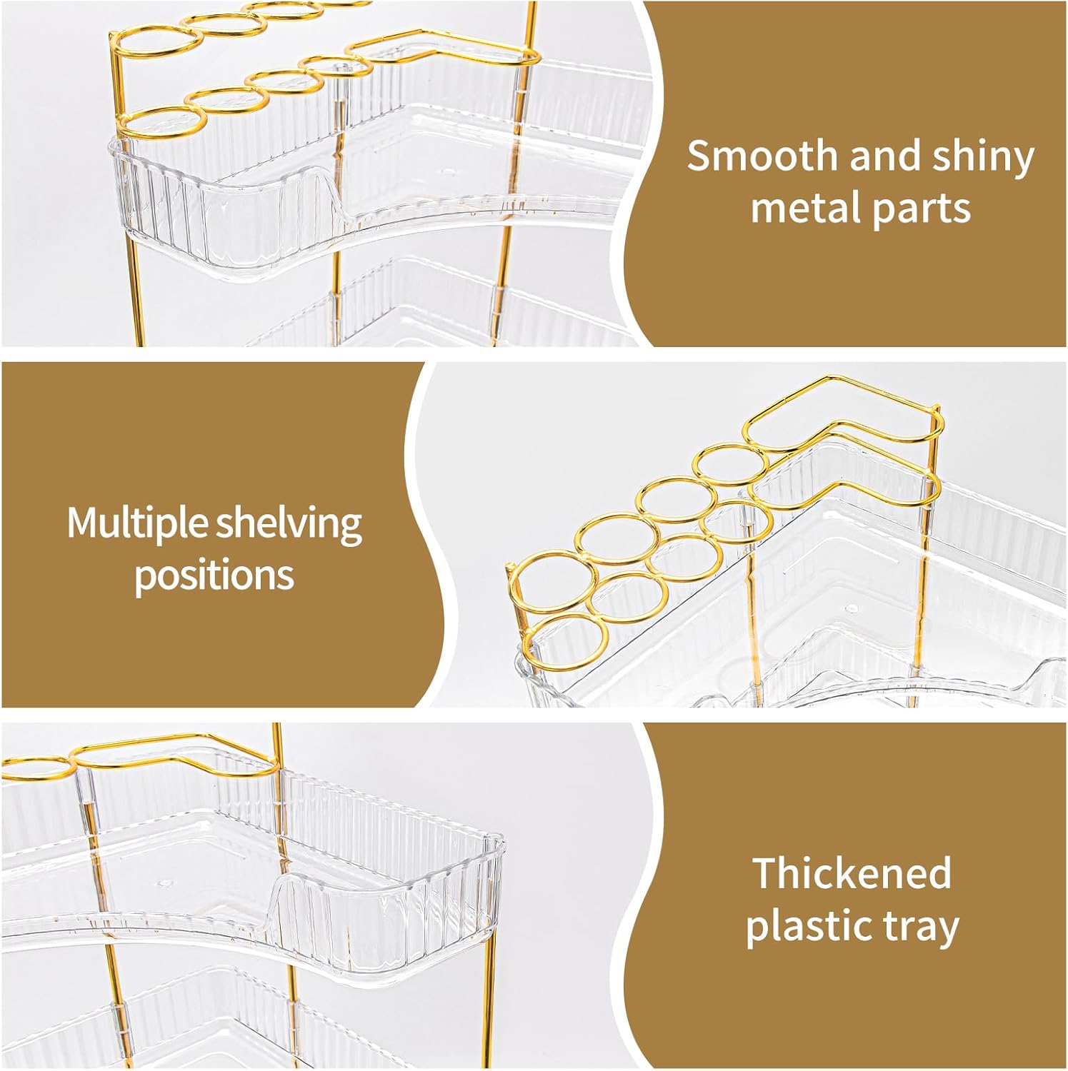- ăDecorative Perfume OrganizerăGolden rod and clear trays will definitely catch your eyes at a glance. Get this beautiful display shelf for your beloved perfumes, skincares, and cosmetics