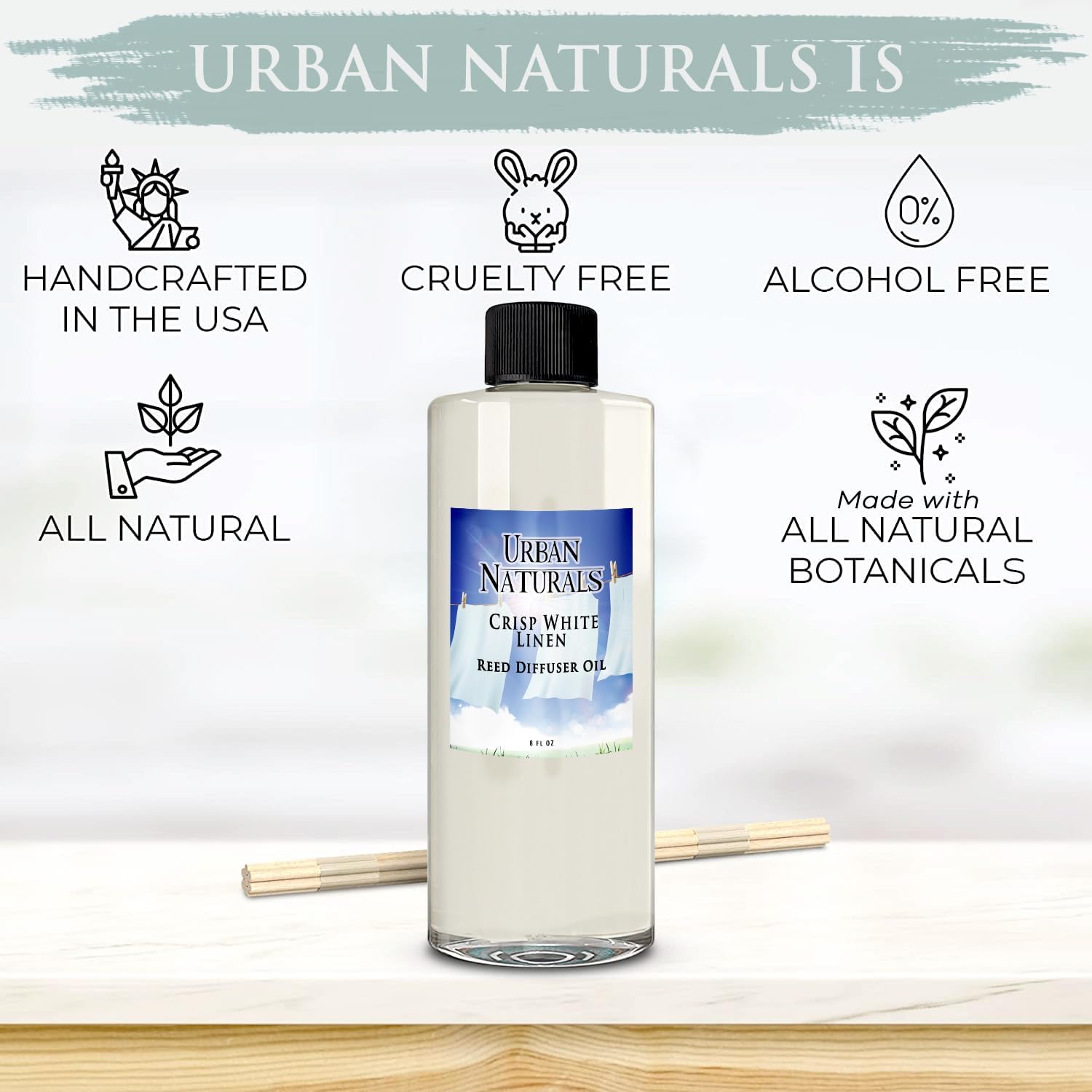 Urban Naturals Reed Diffuser Oil Refill Crisp White Linen with Fresh Linen, Clean Breeze, Soft Cotton 8 oz + Free Reed Sticks, Made in The USA