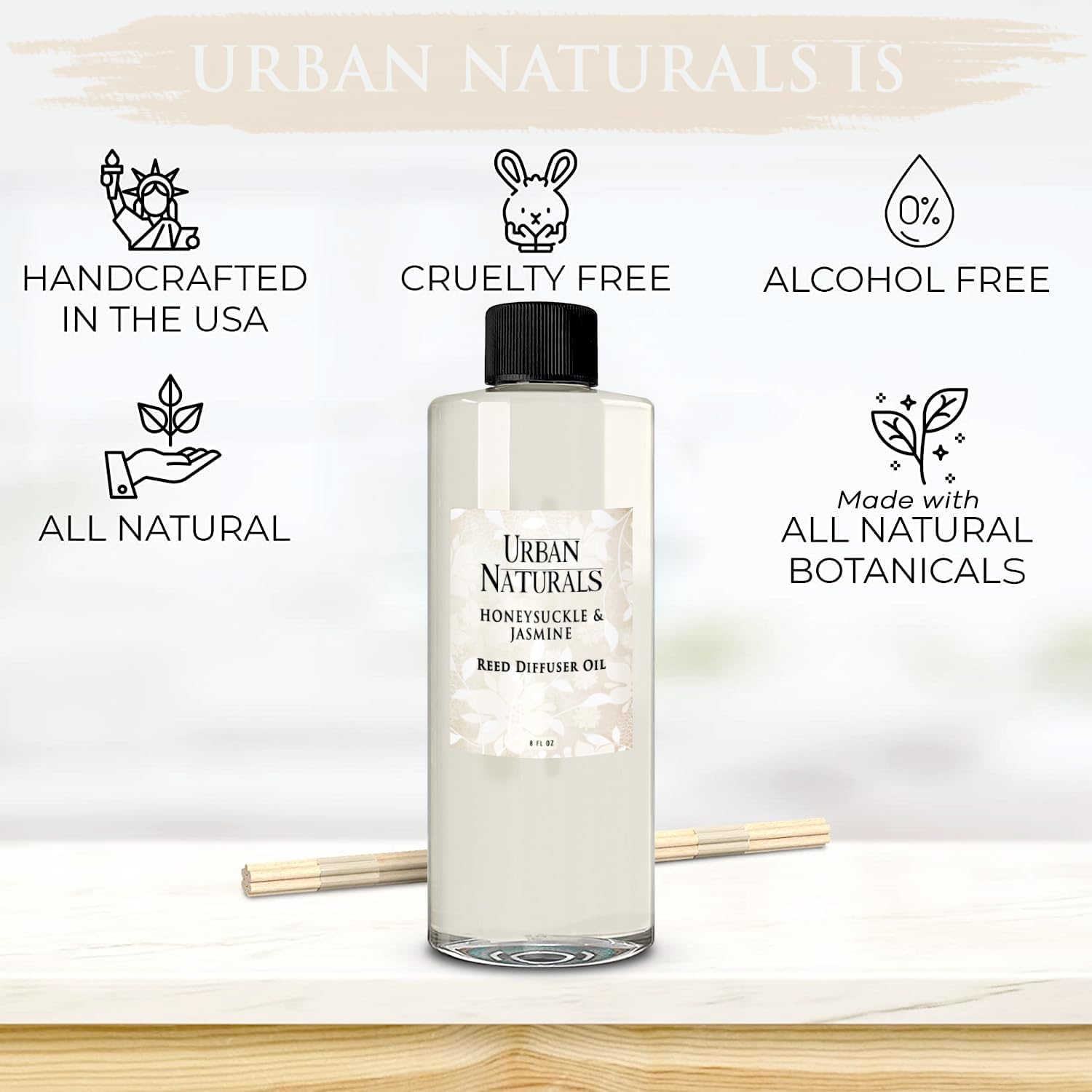 Urban Naturals Reed Diffuser Oil Refill Honeysuckle Jasmine with Hyacinth, Cassis, Neroli, Rose, Iris, Lily of The Valley 8 oz + Free Reed Sticks, Made in The USA