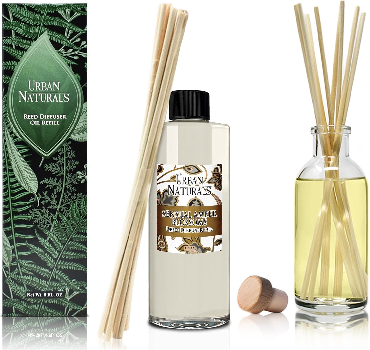 Urban Naturals Reed Diffuser Oil Refill Sensual Amber Blossoms with Jasmine, Freesia, Plum, Orange Blossom, Vanilla 8 oz + Free Reed Sticks, Made in The USA