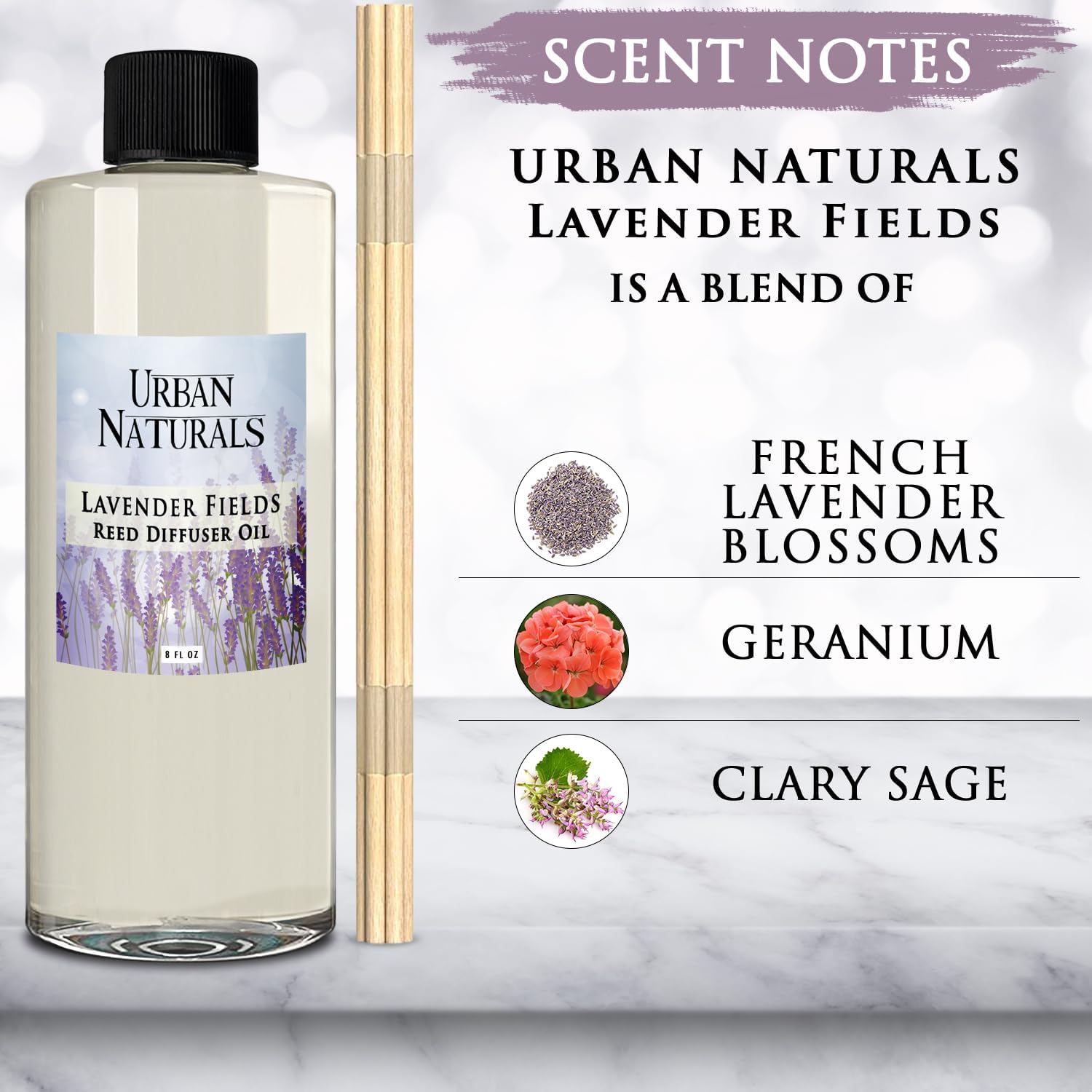 Urban Naturals Reed Diffuser Oil Refill Lavender Fields with Geranium, Clary Sage, Soft Florals 8 oz + Free Reed Sticks, Made in The USA