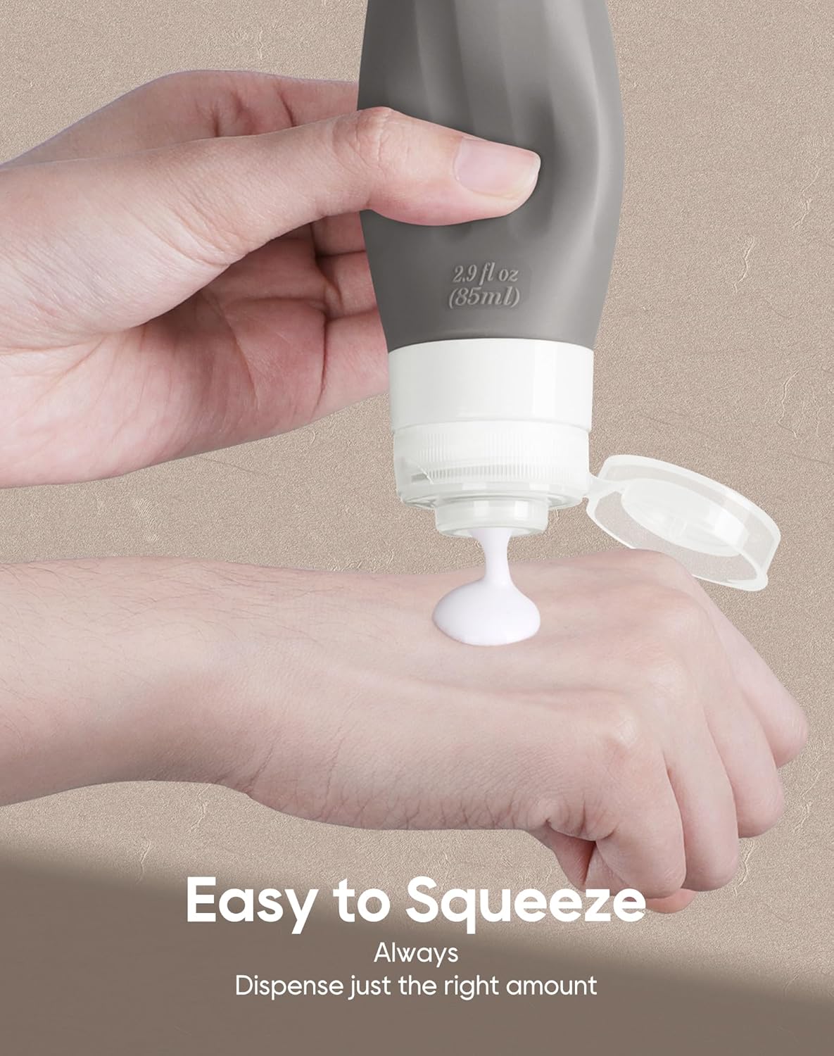 - SAFE SILICONE MATERIAL: Made of Food Grade BPA Free Silicone, this travel set is sturdy, soft, squeezable, flexible and reusable. Safe material guarantee that you can not only use them to store shampoo, conditioner, face soap, sunscreen, creams, lotion or etc, but also safe for food, various seasonings. Soft silicone body make you squeeze out contents easily