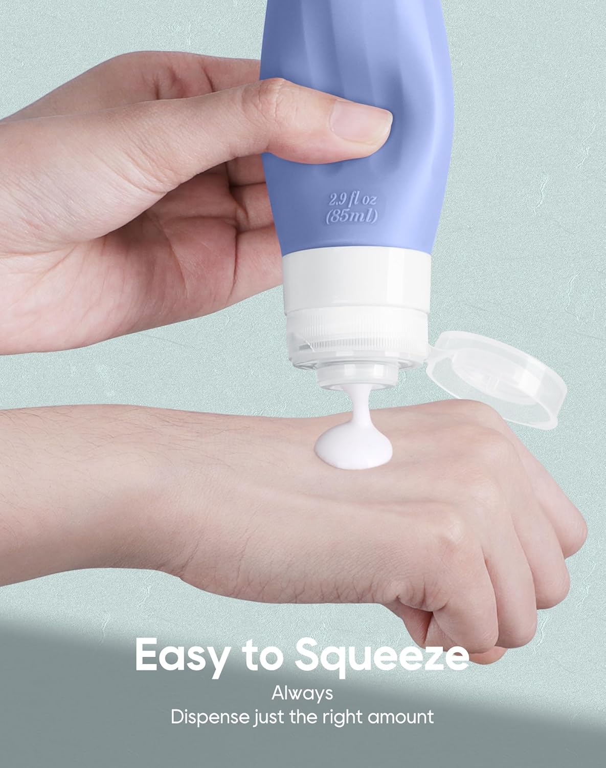 - SAFE SILICONE MATERIAL: Made of Food Grade BPA Free Silicone, this travel set is sturdy, soft, squeezable, flexible and reusable. Safe material guarantee that you can not only use them to store shampoo, conditioner, face soap, sunscreen, creams, lotion or etc, but also safe for food, various seasonings. Soft silicone body make you squeeze out contents easily