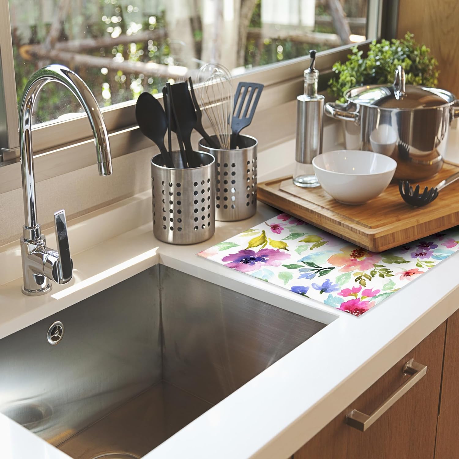 - MULTI-FUNCTIONAL: You can let it catches drips under a dish drying rack to keep the counter dry and clean, or you can place bottles, pots, pans, plates, bowls, cups, knives, silverware, serve ware, glassware, stemware, tableware and so on directly on the mat.