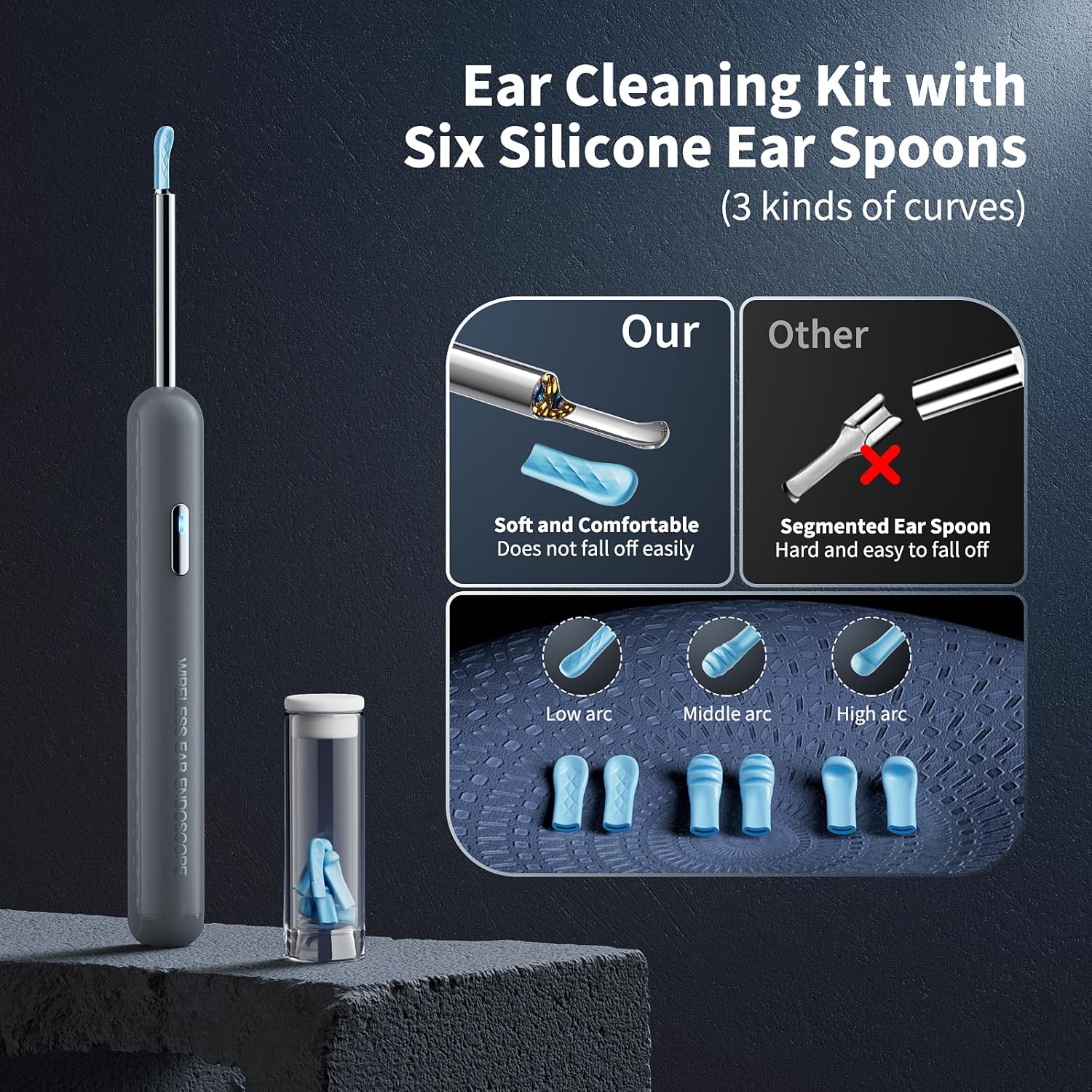 - [ 3 Kinds of Curved Soft Spoons ]The earwax cleaner camera has five highly flexible interchangeable silicone ear spoons. The clean earwax wifi visible wax removal spoon is made of soft silicone material and fits and cleans the ear comfortably. Please note that before each use, please tighten the silicone sleeve on the ear spoon to avoid scratching the ear canal.