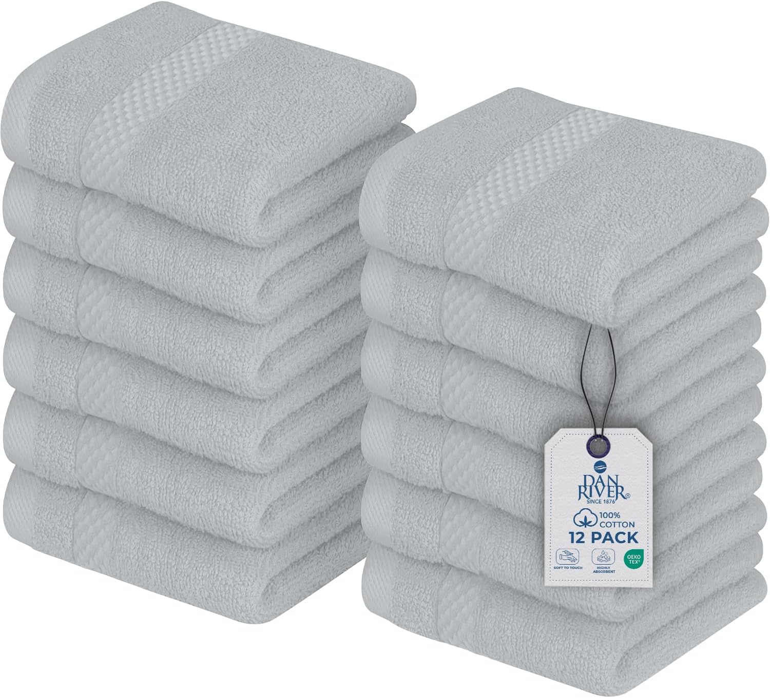 DAN RIVER 12-Pack Premium 100% Cotton Highrise Face Towels – Reusable Face Towel Set, Absorbent & Soft Wash Towels for Bathroom & Body – Hand and Face Towels, 550 GSM (12x12 in)