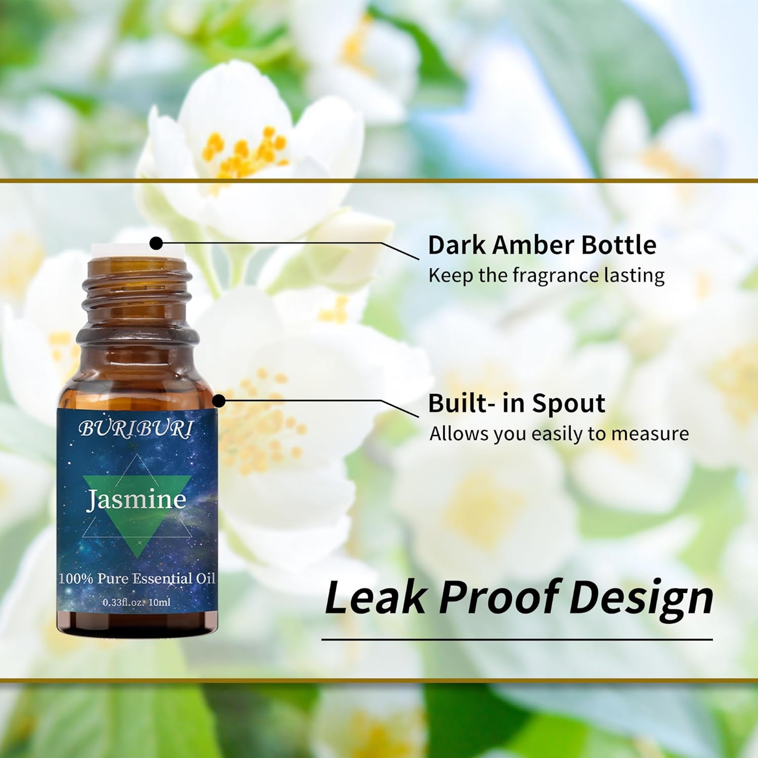 - Packing Includes: 10ml Jasmine Oil x1, 10ml Eucalyptus Oil x1. With no adulterants or dilution, 100% pure quality. BURIBURI scented oil is bottled in a durable amber glass bottle.