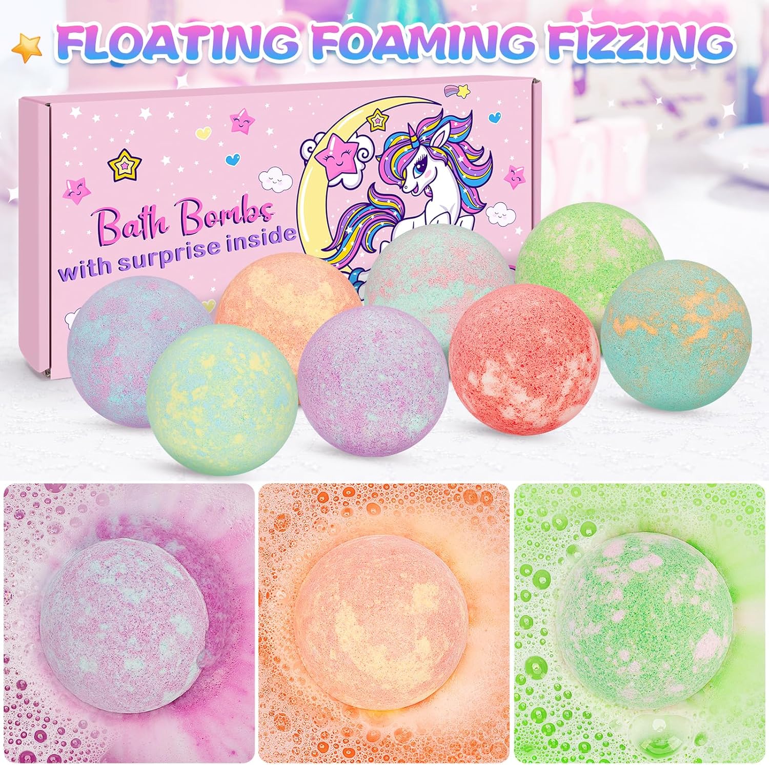 - Perfect Gift for Girls & Kids -8 pack bath bombs for kids with surprise toys inside for 4-8-year-old gifts. Super cute packaging and deluxe bath bomb gifts for kids with unicorn toys for Birthdays, and Christmas. Super-cute designs bring a fun festive atmosphere for kids to have an unforgettable!