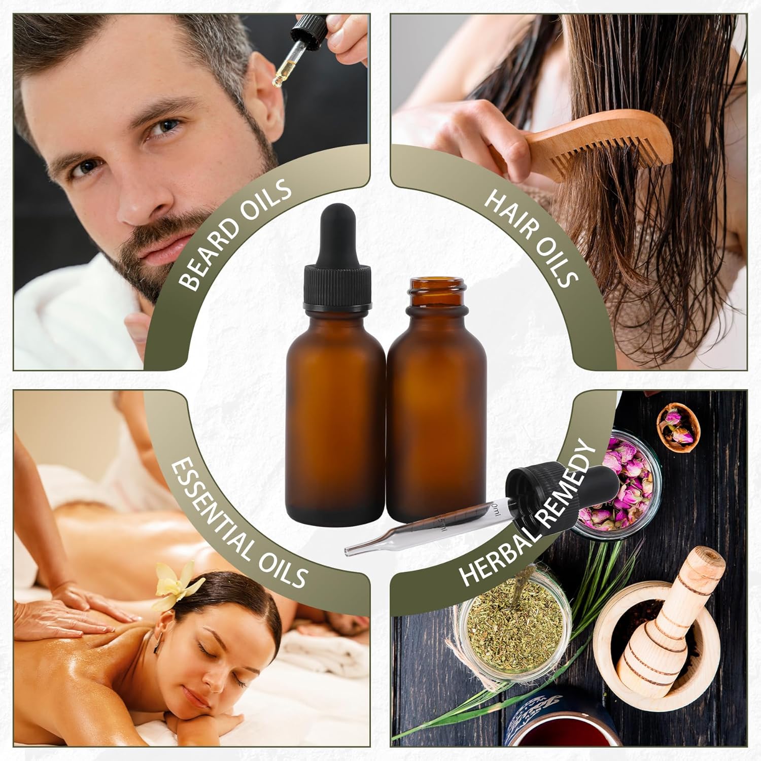 - 🧴【Multi-purpose】Eye dropper bottle can be as dispensers, you to fill in essential oils, colognes, tinctures, cosmetics, perfume oils, beard oils, hair oils or other liquids.This makes it easy to show samples to clients in your massage, beauty shop, hair salon, aromatherapy and alternative medicine practice.