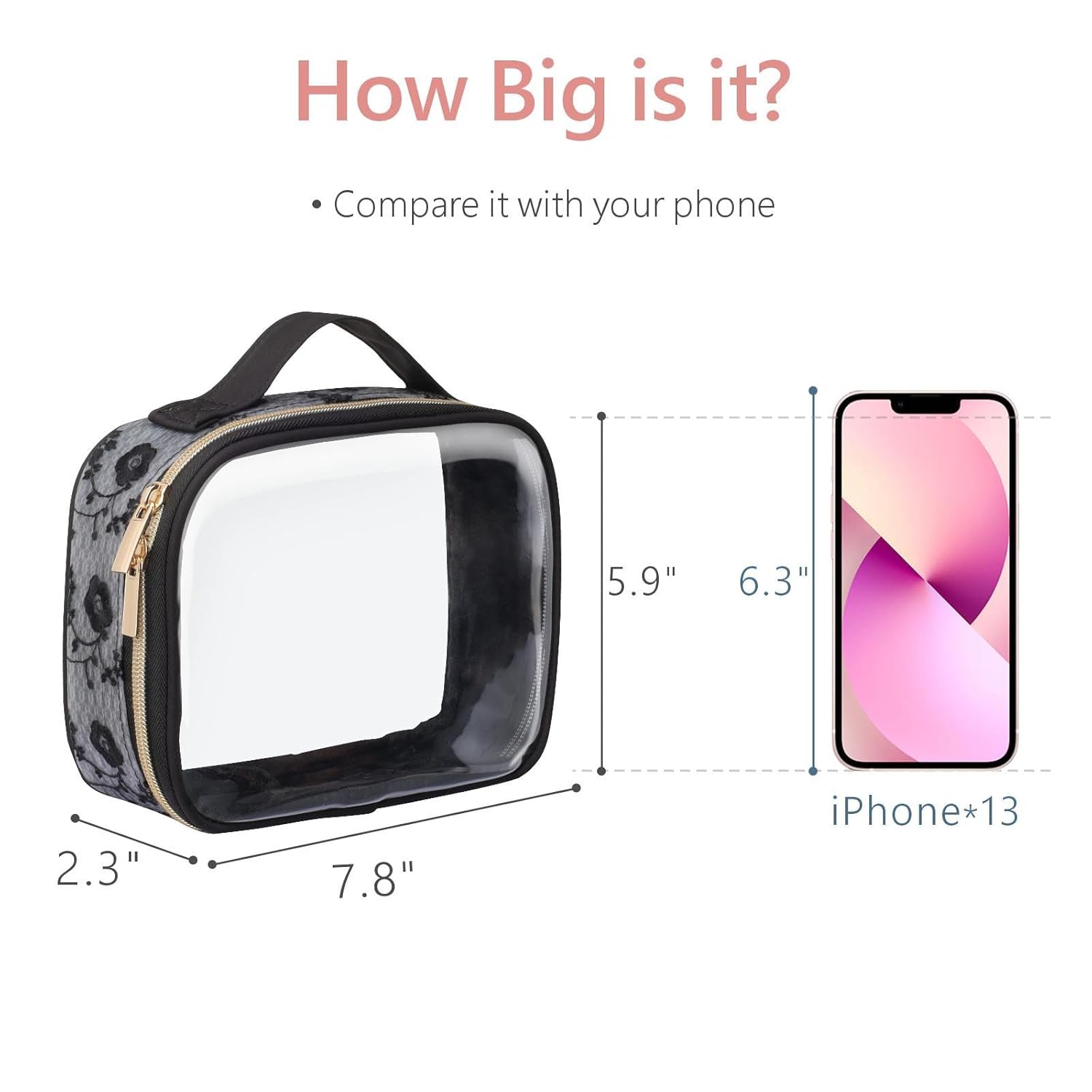 PACKISM TSA Approved Toiletry Bag - 180° Large Opening Clear Makeup Bags with Handle, Easily Access, Floral Texture Lace Clear Toiletry Bags for Traveling, Thick 0.5 mm No Smell, Black