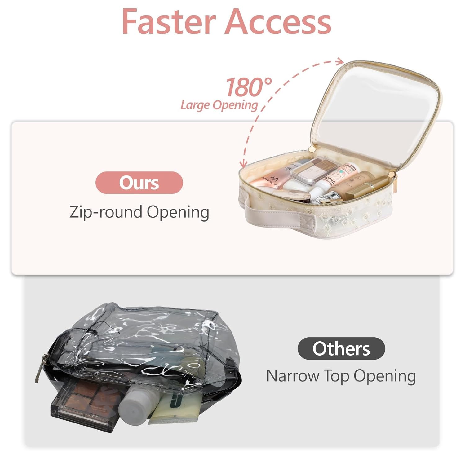 - Zip-around Opening, Easy to Use: Double zippers can be opened by 180%, so the clear travel bags for toiletries can be flip-opened horizontally, facilitating access to travel essentials. The humanized handle design allows this clear bag to be lifted and hung conveniently