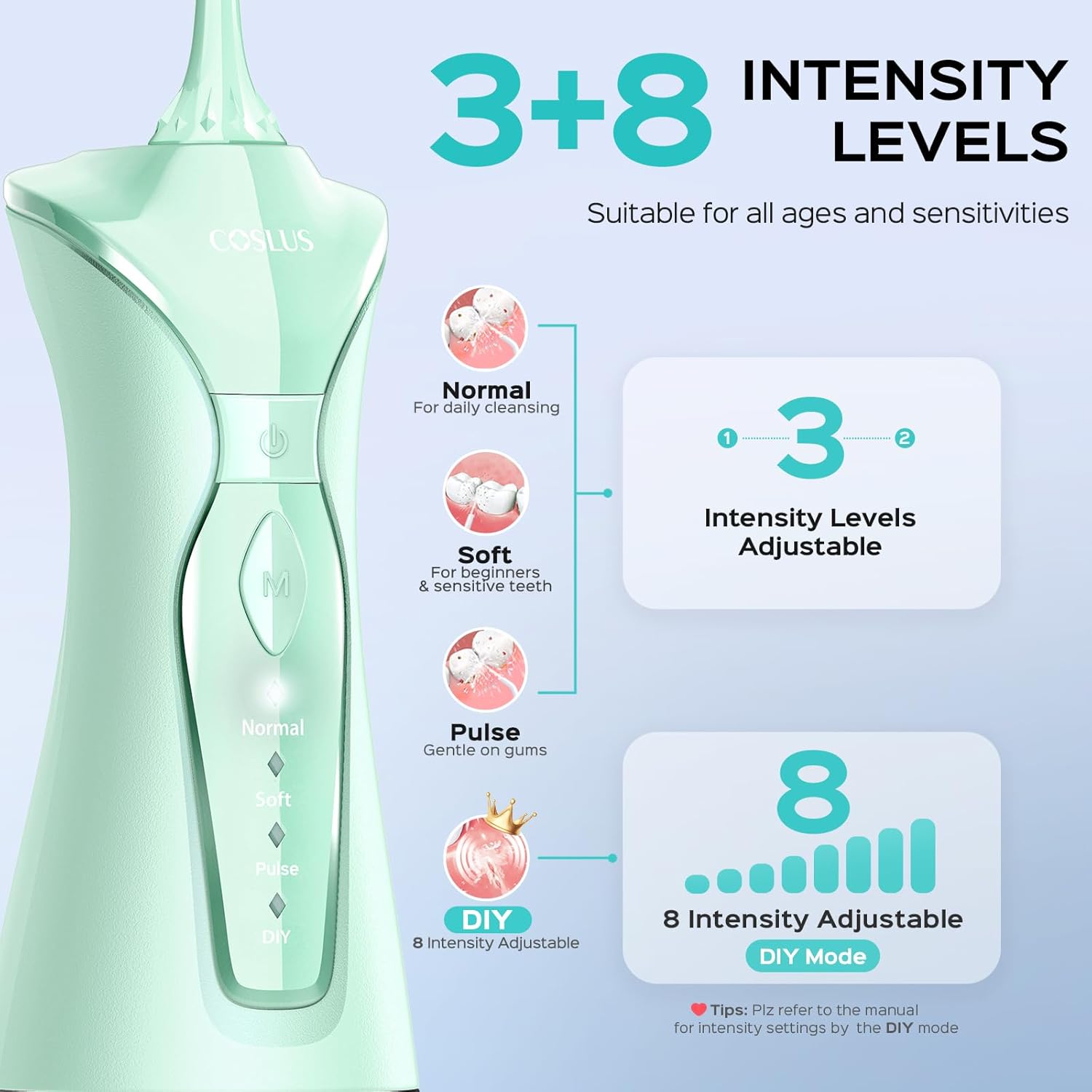 - Upgraded 4 Modes 11 Intensity, DIY Choice: This cordless water flosser has been upgraded with 8-Level custom pressure from daily oral care to braces, orthodontic and sensitive gum care. 4 modes precision cleaning (Daily/Gentle/Deep/Custom) from children to seniors meets the oral health all age groups, The memory function enables one-touch operation for ease of use. This portable water flosser protects your oral health in a more scientific and personalized way, ideal for home use or family trips