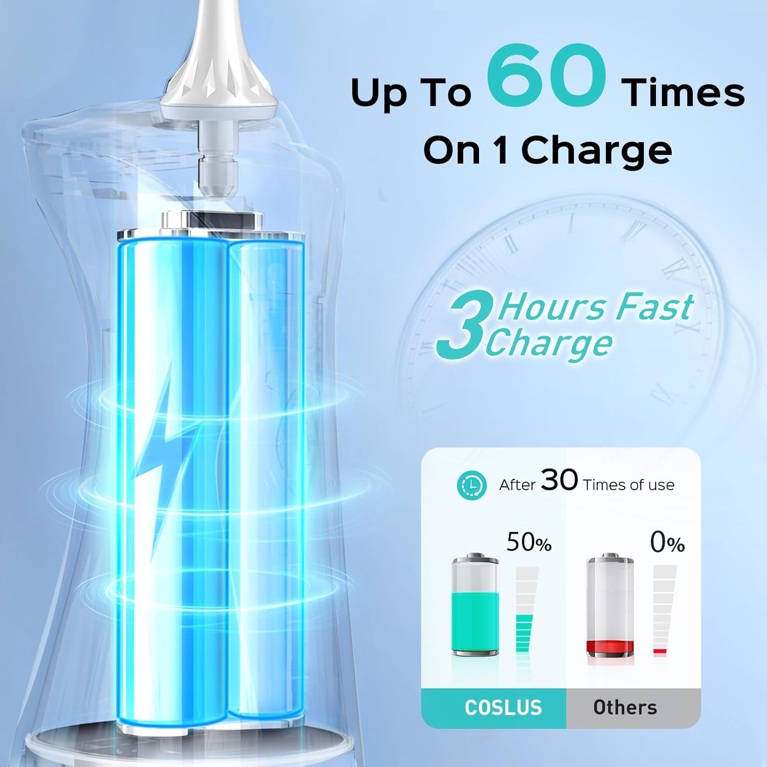 - 3 Hour Fast Charging, 60 Uses Extended Battery Life for On-the-Go Use: The portable travel water dental pick flosser features a powerful green battery that is double the time of other models. It only 3-hours full charge and lasts 60 times per charge trips. Its lightweight & compact design easy keep in work bag, making it easy to use in travel, office, and business trip oral care without any burden. It also comes with a USB cable (adapter not included) for easy charging