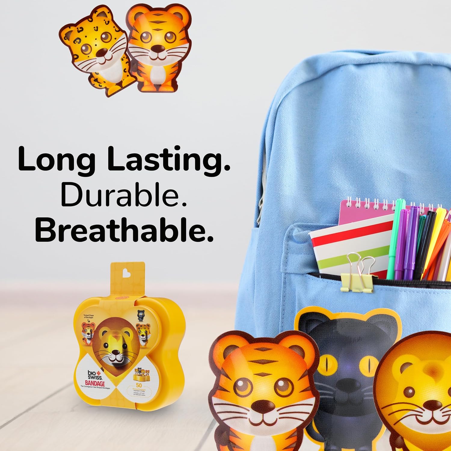 - 50 JUNGLE CAT KIDS BANDAGES: Fun cat-shaped adhesive bandages plastic box helps protect cuts, scrapes, and minor wounds while making healing less stressful for children; bandages come in 4 assorted styles
