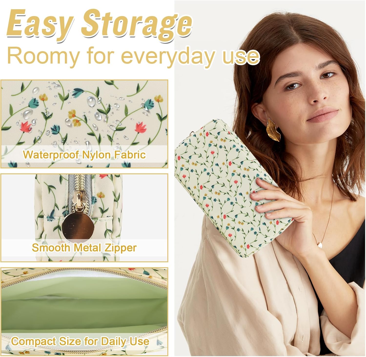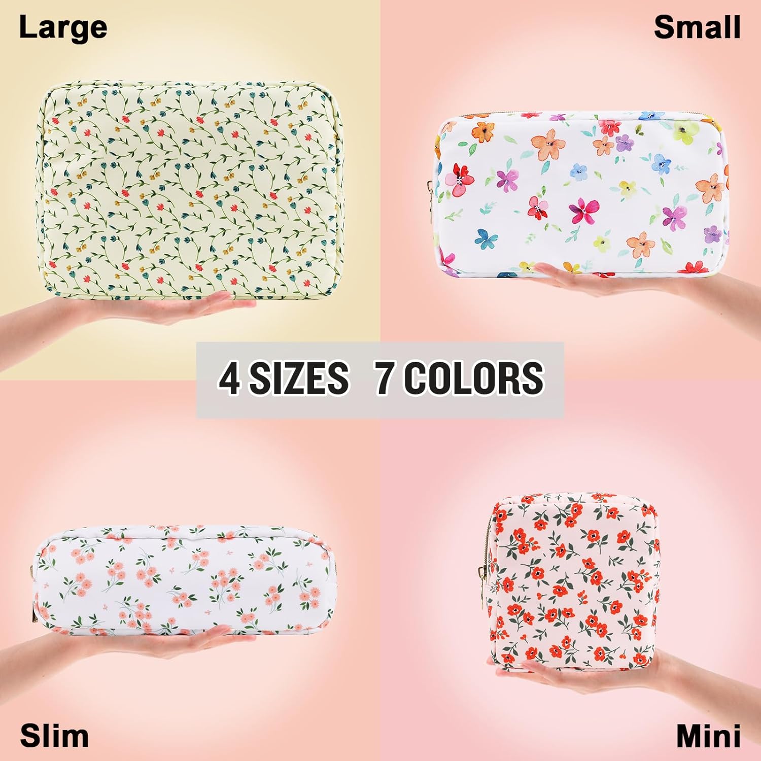 - ❤【Multiple Sizes & Colors】Large, Small, Mini, or Slim, we have it all! Cosmetic bags are available in many colors: Blue-Daisy, Green-Daisy, White-Flower, Pink-Flower and other colors for you to choose. Nylon makeup bag for purse can be used for travel, outdoors and organization, it can be used as a coin pouch, purse bag, travel pouch, clutch, makeup organizer and more.