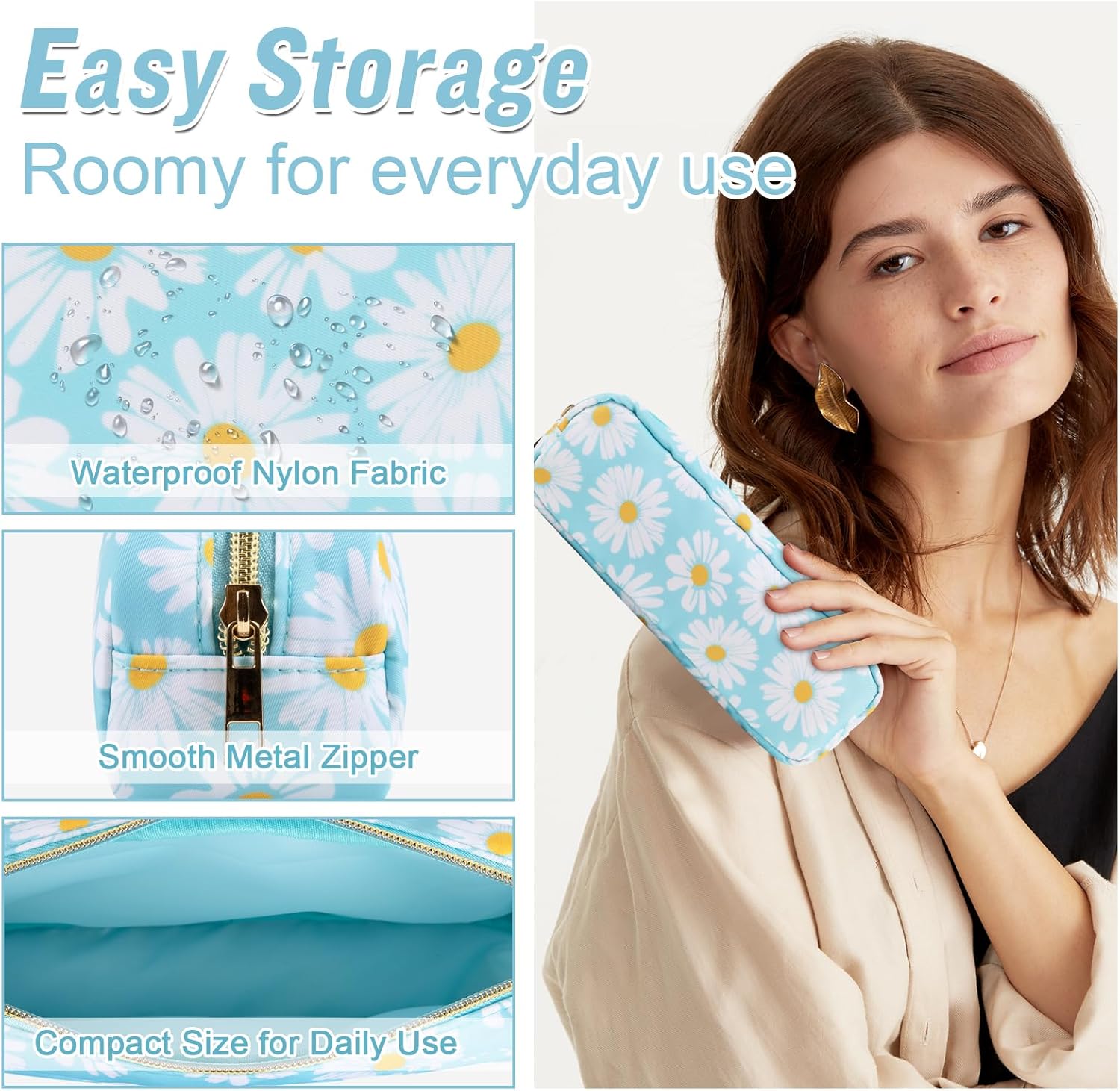 - ❤【Multiple Sizes & Colors】Large, Small, Mini, or Slim, we have it all! Cosmetic bags are available in many colors: Blue-Daisy, Green-Daisy, White-Flower, Pink-Flower and other colors for you to choose. Nylon makeup bag for purse can be used for travel, outdoors and organization, it can be used as a purse bag, travel pouch, clutch, makeup organizer and more.