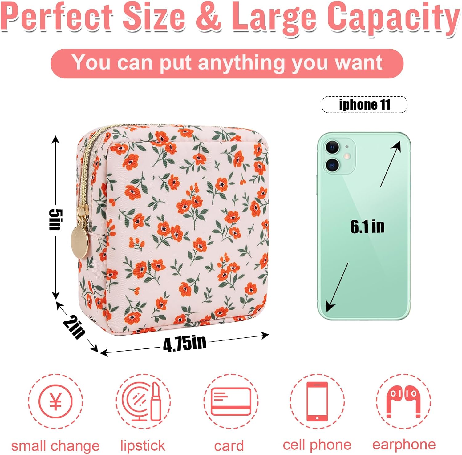 - ❤【Compact & Perfect Size】Mini Flower Makeup Bag Size is 5*4.75*2inch/12.7*12*5cm, the compact storage bag can store all your sanitary napkins, lip balms, lipsticks, cosmetics, mini mirrors, jewelry, keys, cash, credit cards, etc. The easy and large opening design makes it easy to take. Keep your contents separate and organized.