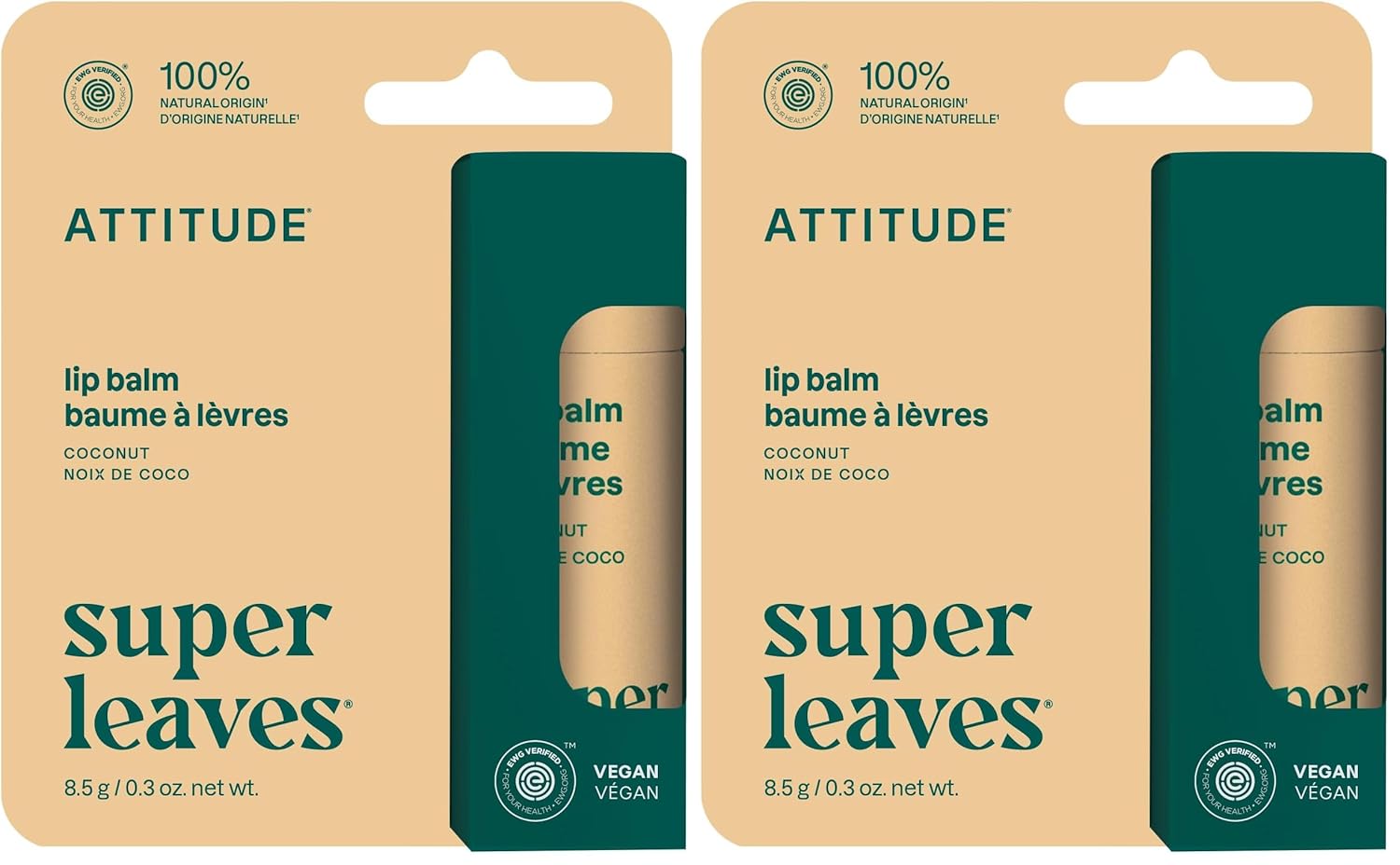 ATTITUDE Plastic-free Lip Balm, EWG Verified Plant- and Mineral-Based Ingredients, Vegan and Cruelty-free Personal Care Products, Coconut, 0.3 Oz (Pack of 2)