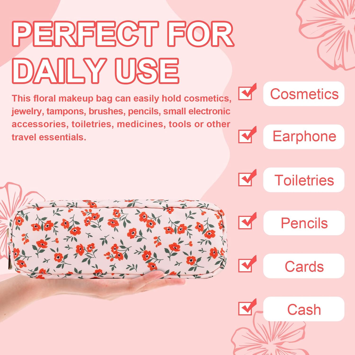 - 【Superior Quality】The floral makeup bag is made of lightweight and durable high quality nylon. It is waterproof and easy to clean, helping to protect your cosmetics and toiletries from water spill accidents. Age grading: 156months+;Age group applied in testing: Over 3 years.