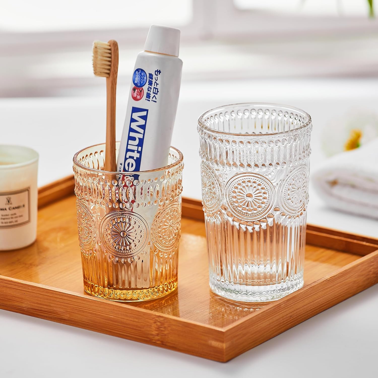 - Design : The dispenser features a modern, minimalist design that effortlessly complements any décor. Its sophisticated look making it a standout accessory on your countertop. Made of high-quality glass, it not only looks great but also feels durable and substantial in your hand.