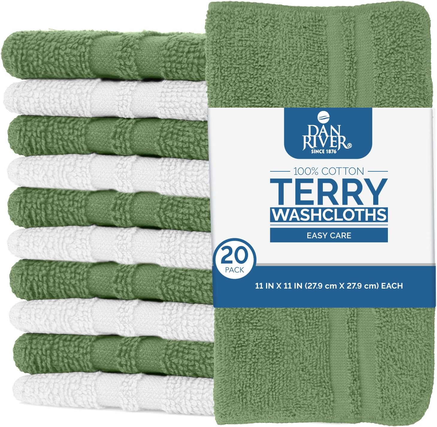 DAN RIVER 100% Cotton Washcloths 20 Pack Premium Quality Face and Body Cloth, Quick Dry Essential Towels for Bathroom, Hand, Kitchen & Cleaning, Baby Rugs | 11X11 in | 400 GSM | Sage Green+White