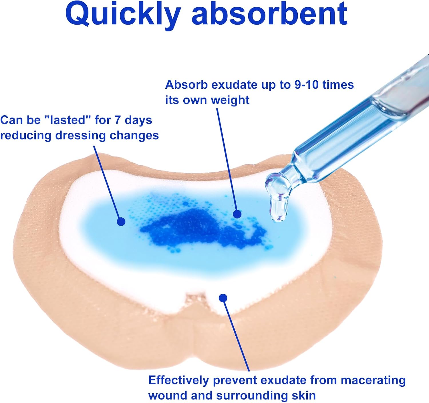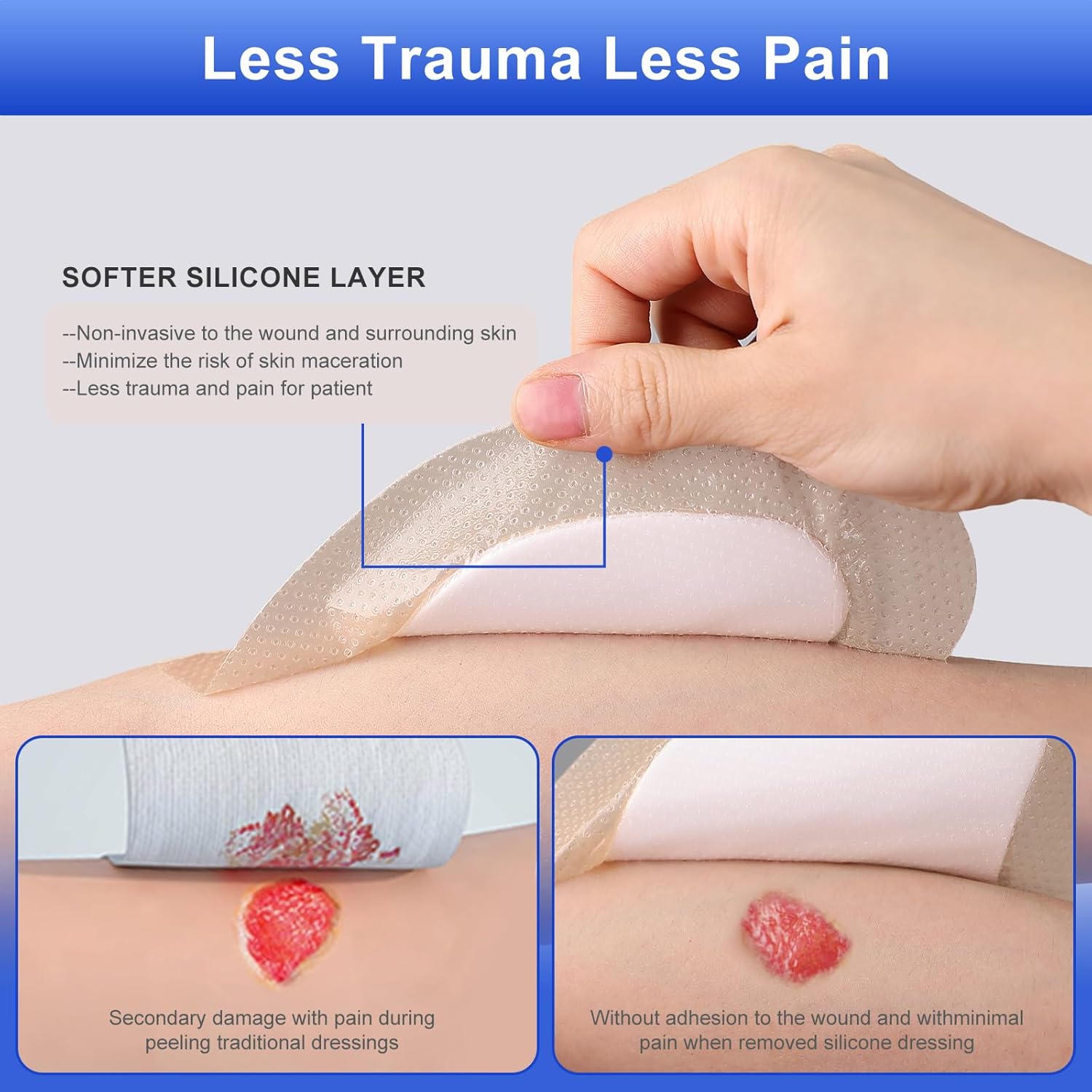 - 【High Absorbency, Promote Healing】The silicone bandages consists of 5 layers: a PU film, SAF super absorbent core, a non-woven layer, a soft thick pad, and an anti-allergic silicone layer for wound contact. The waterproof bandages adheres to the surface of the wound, absorbs and locks in exudate, provides a sterile, moist wound environment, and accelerates the healing process.