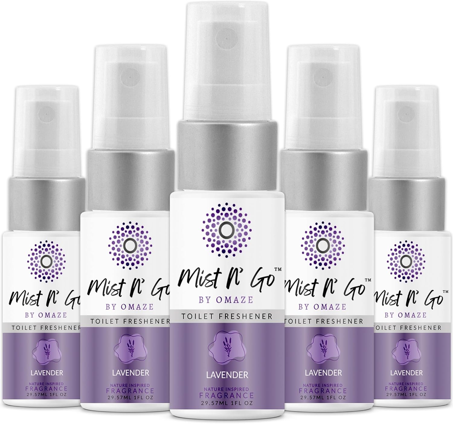 Mist N’ Go by Omaze Travel Bathroom Spray for Toilet Spray Odor Eliminator - Travel Toilet Spray for Bathroom Air Freshener Spray for Bathroom Deodorizer - Lavender Travel Size (1oz x5)