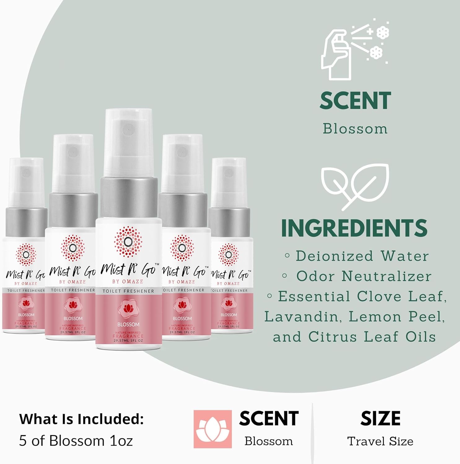 Mist N’ Go by Omaze Travel Bathroom Spray for Toilet Spray Odor Eliminator - Travel Toilet Spray for Bathroom Air Freshener Spray for Bathroom Deodorizer - Blossom Travel Size (1oz x5)