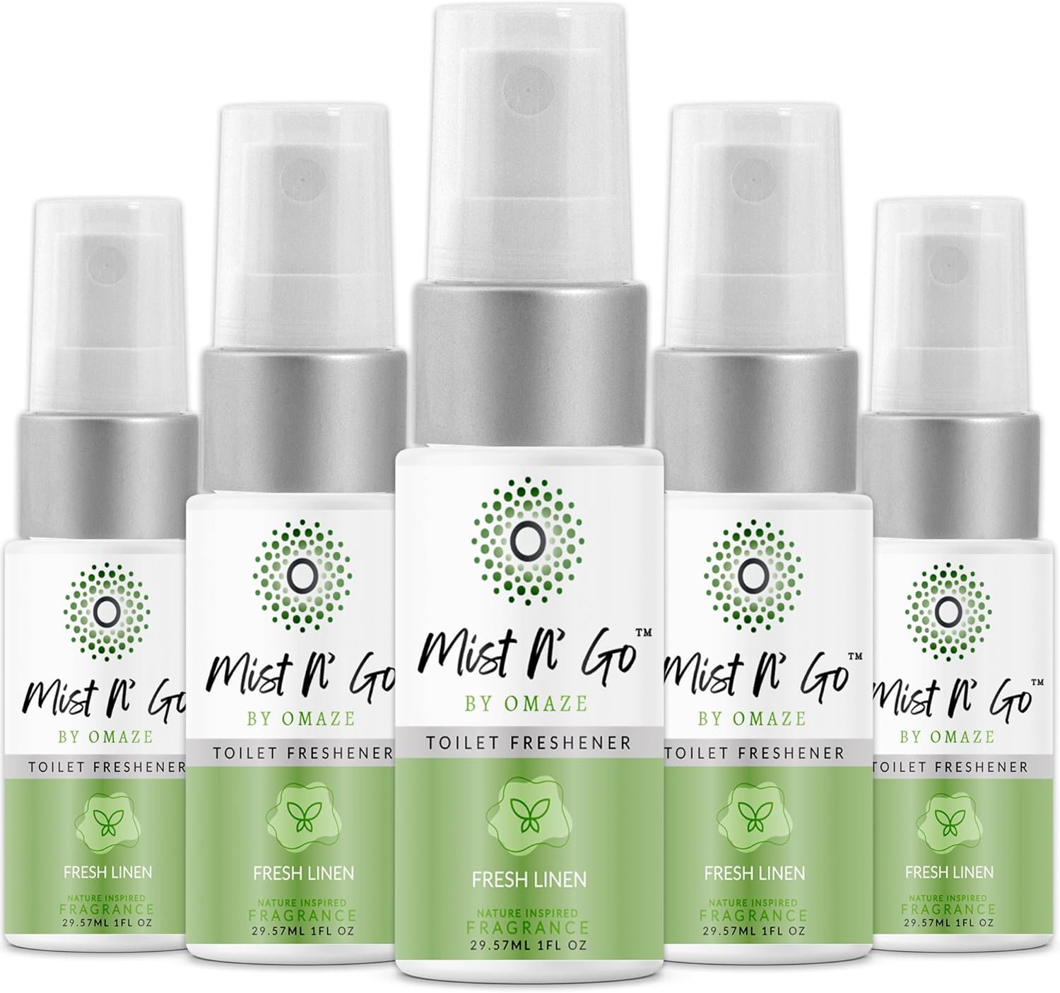 Mist N' Go by Omaze Travel Bathroom Spray - Toilet Odor Eliminator & Air Freshener - Fresh Linen (1oz x5)