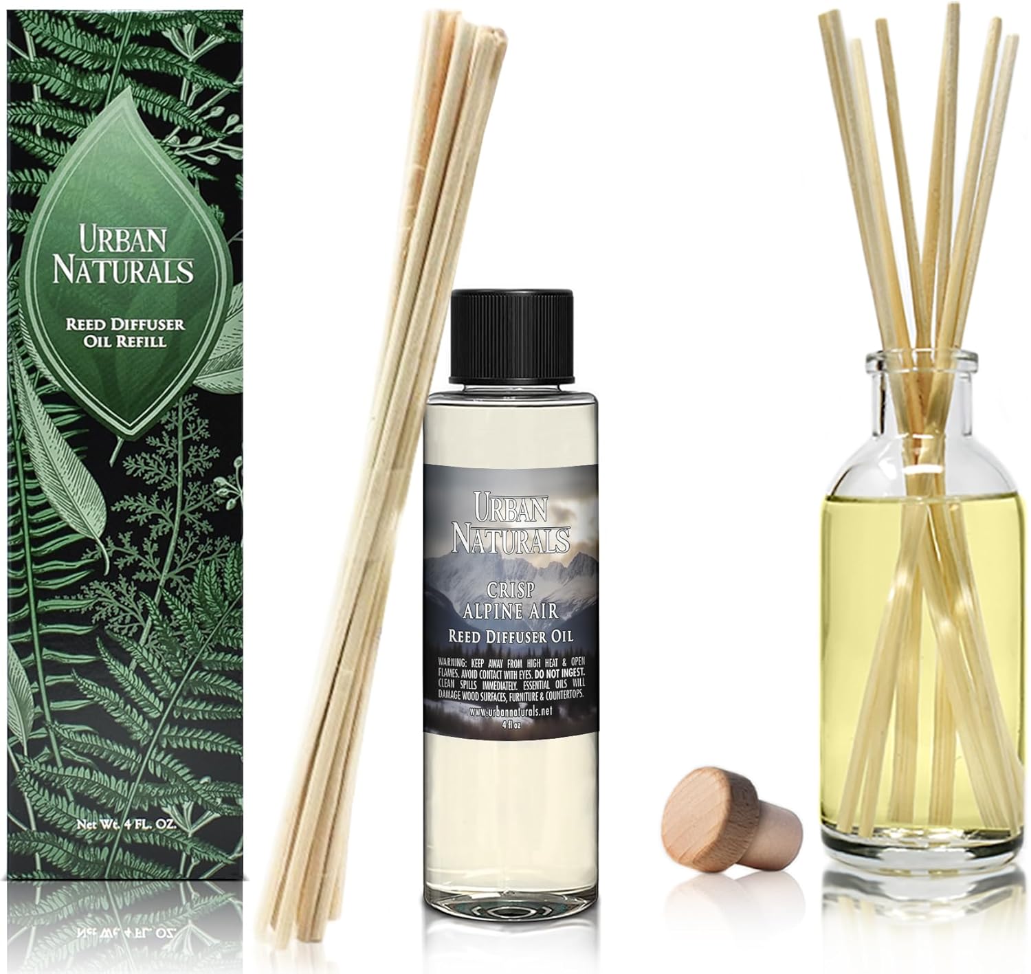 Urban Naturals Reed Diffuser Oil Refill, Crisp Alpine Air Diffuser Oils with Eucalyptus, Pine, Citrus, 4 oz + Free Reed Sticks, Made in The USA