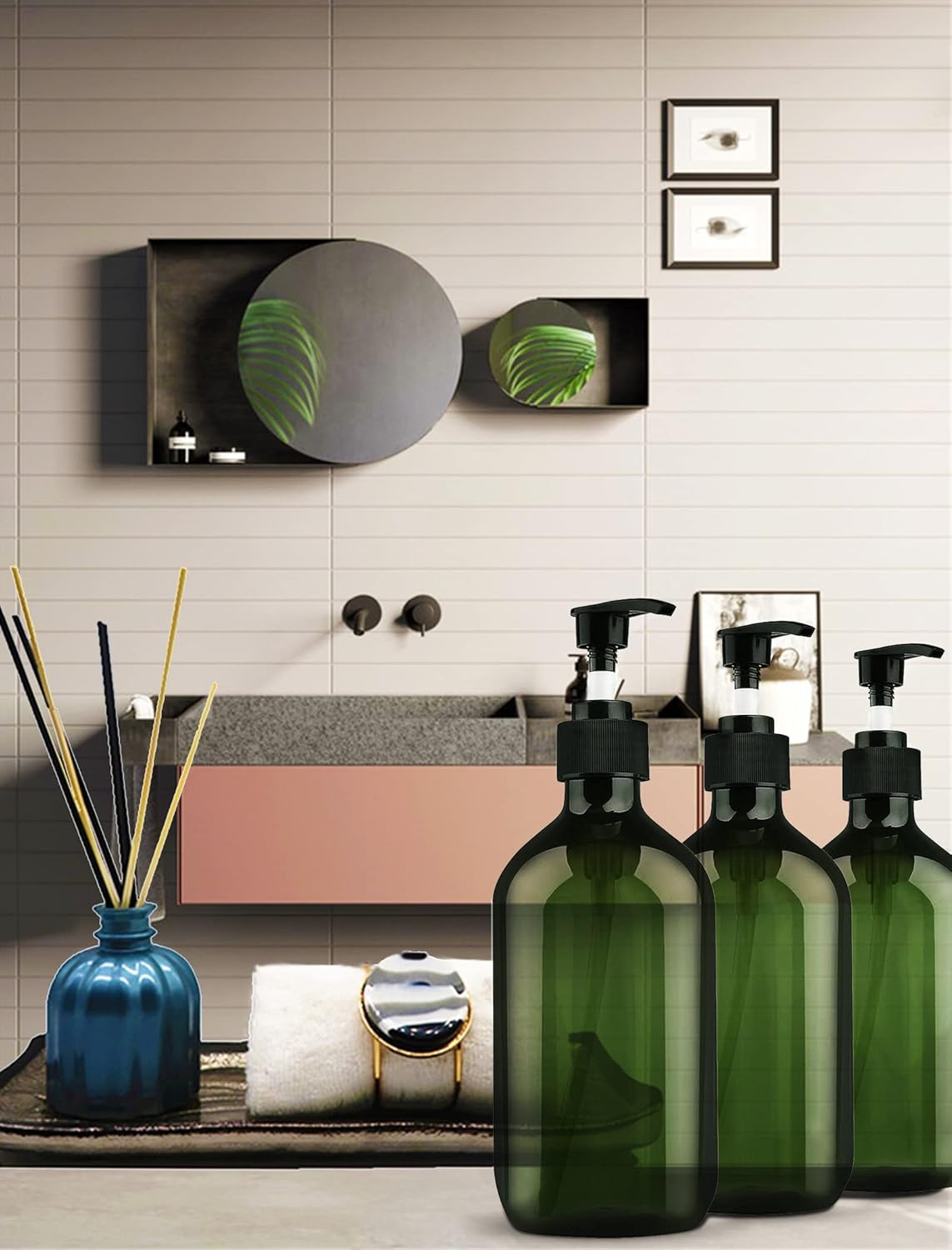 FOOCHY 6 Pack Empty Plastic Bottles with Pump Dispenser and 6pcs Labels Included, Refillable Travel Containers for Hand sanitizer Shampoo Lotion, etc - No BPA/Paraben, 500ml/16.9oz (Green)