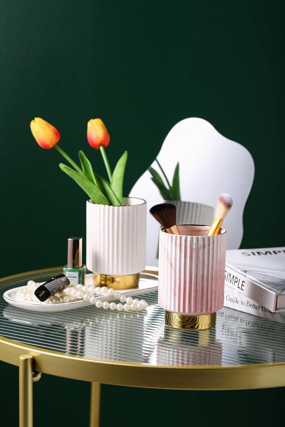 - DESIGN:Pink and gold pairing striped design allow this makeup holder more gorgeous and fashion.The base and cup mouth tube edge of the makeup stand is designed with metal gold plating making itself be a work of art,Let you experience luxury feeling and visual effect.