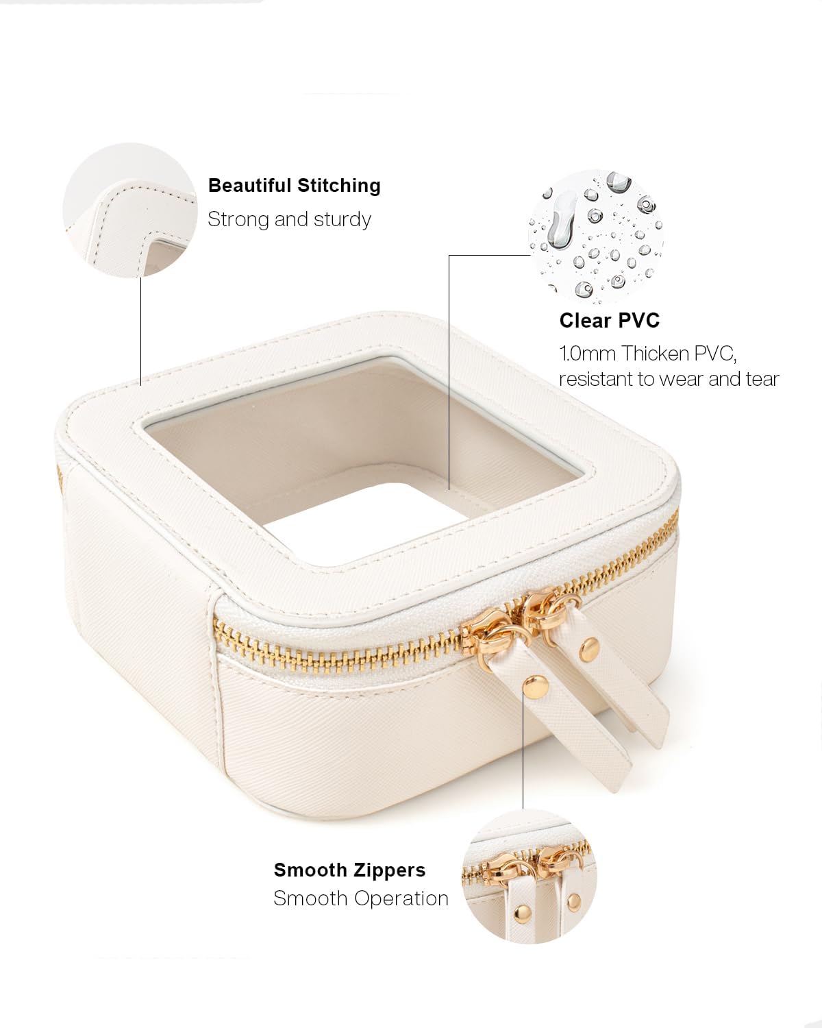 - Small and Clear Design: You will get 1PCS small minimalist boxy shape travel makeup bag which is sleek and minimalistic look for your makeup accessories collection. And is designed with a transparent PVC window,all items are clear at a glance, and you can quickly choose the cosmetics you need.Portable and lightweight Slip it into your purse, backpack, everyday tote or travelling bag for easy access to your must-have items. Size:5.1'' x 4.8''x 2''
