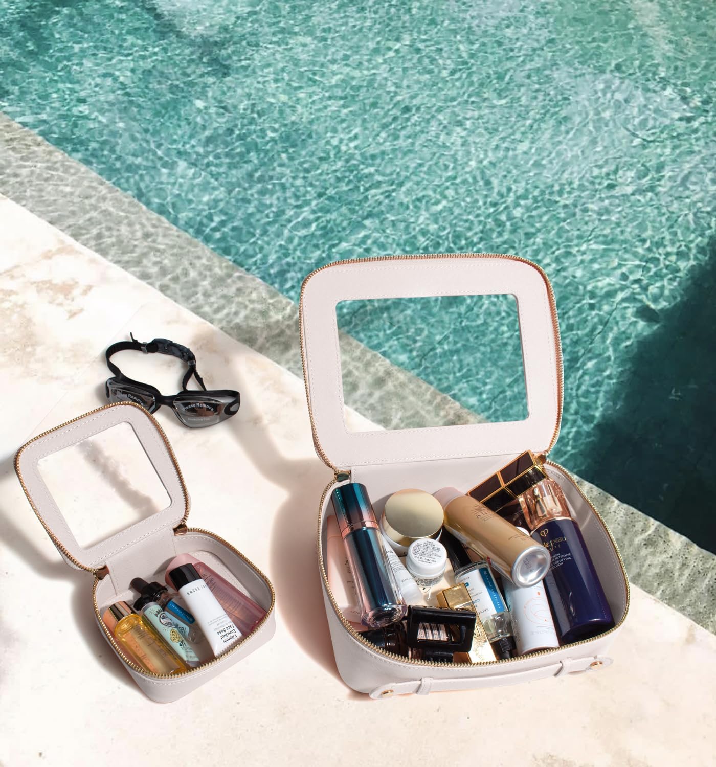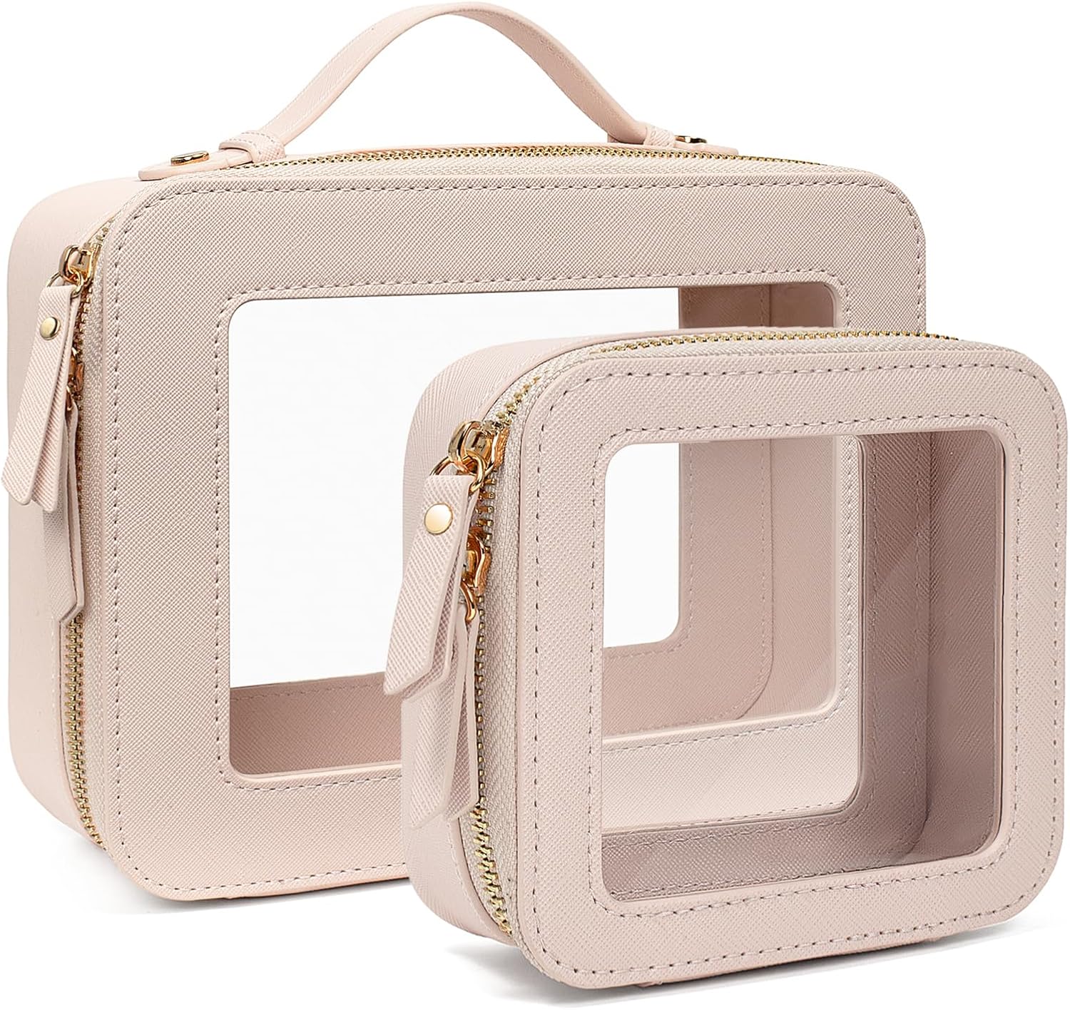 - Clear Design: Our clear toiletry bag set is sleek and minimalistic look for your makeup accessories collection. And is designed with a clear PVC window,all items are clear at a glance, and you can quickly choose the cosmetics you need. Large: 9.44“ x 6.1” x 2.7”, Mini: 5'' x 4.7'' x 2''