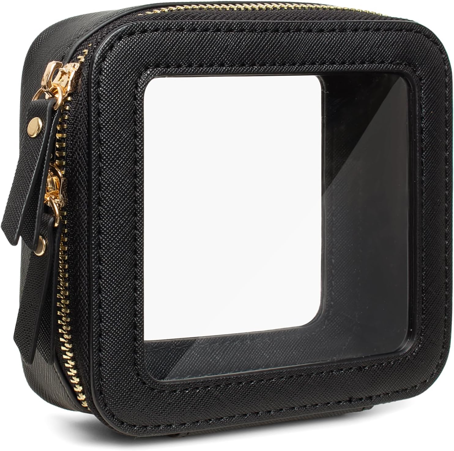 - Small and Clear Design: You will get 1PCS small minimalist boxy shape travel makeup bag which is sleek and minimalistic look for your makeup accessories collection. And is designed with a transparent PVC window,all items are clear at a glance, and you can quickly choose the cosmetics you need.Portable and lightweight Slip it into your purse, backpack, everyday tote or travelling bag for easy access to your must-have items. Size:5.1'' x 4.8''x 2''