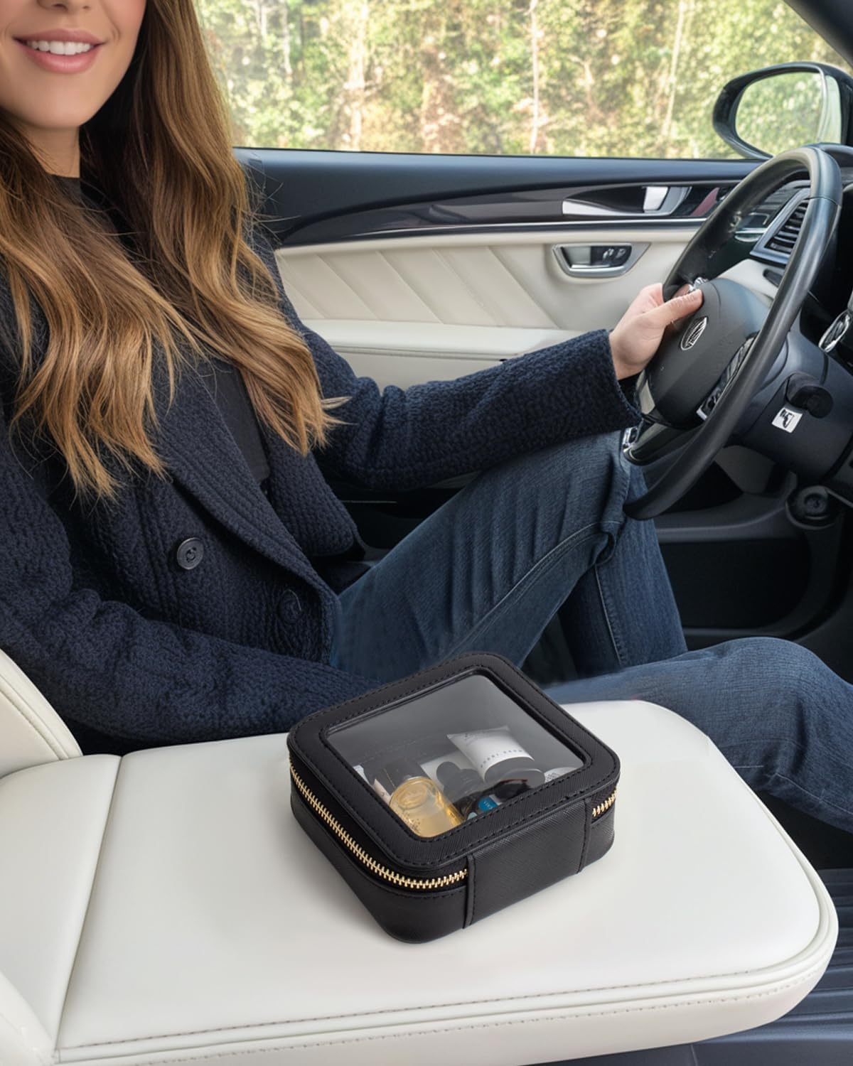 - Car Must Have Essential: Our car essentials small pouch travel toiletry bag is roomy to store your makeup brushes, lipstick, eyebrow pencil, make-up foundation, cables, chargersor and other little items.It make your daily make-up, cream, lipstick, perfume and other beauty things organized and protected.This clear mini toiletry bag can be a good car accessory fits in the center console or other parts of your car